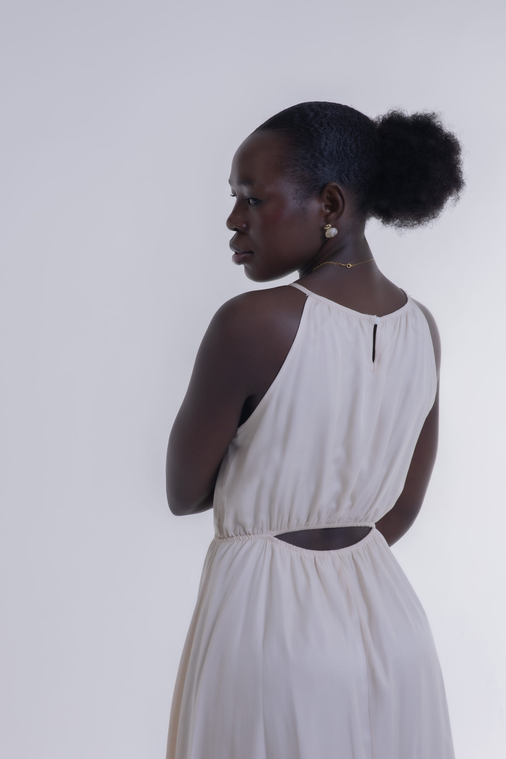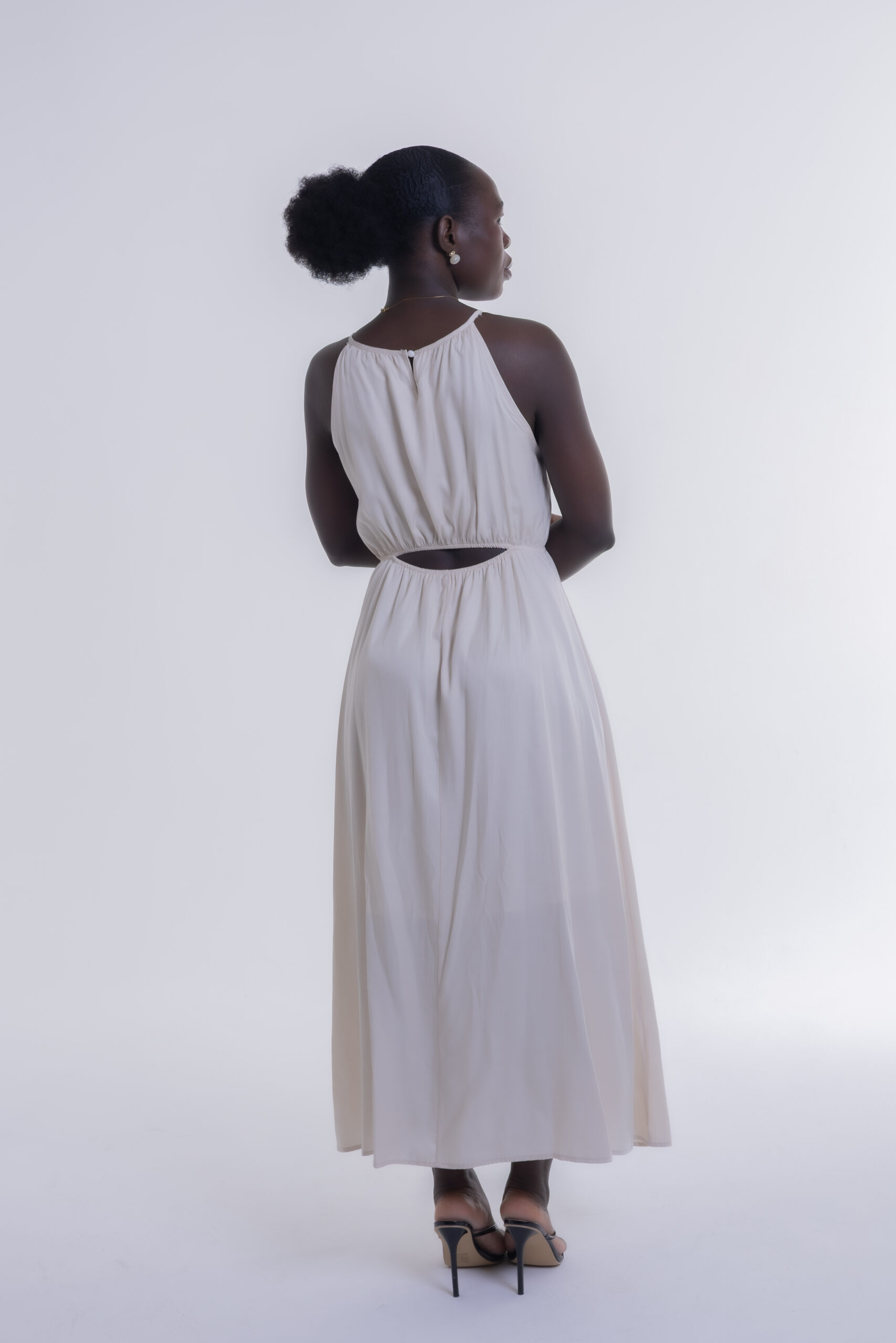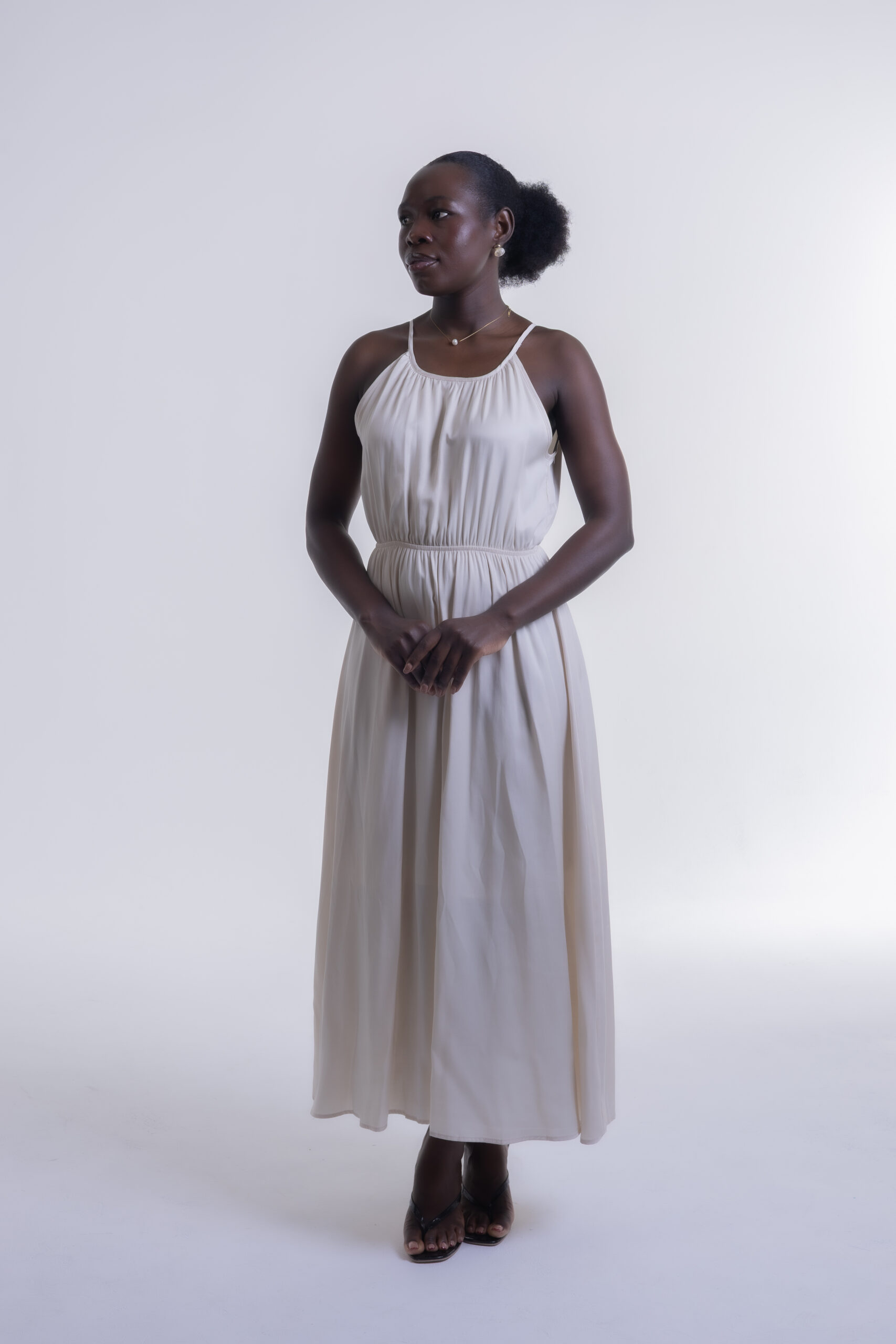 Gracefully minimal and light as air ,the axi dress features as softly gathered halter neckline and a cinched waist that flows into a breezy A-line skirt perfect for warm weather escape or a casual garden gatherings.