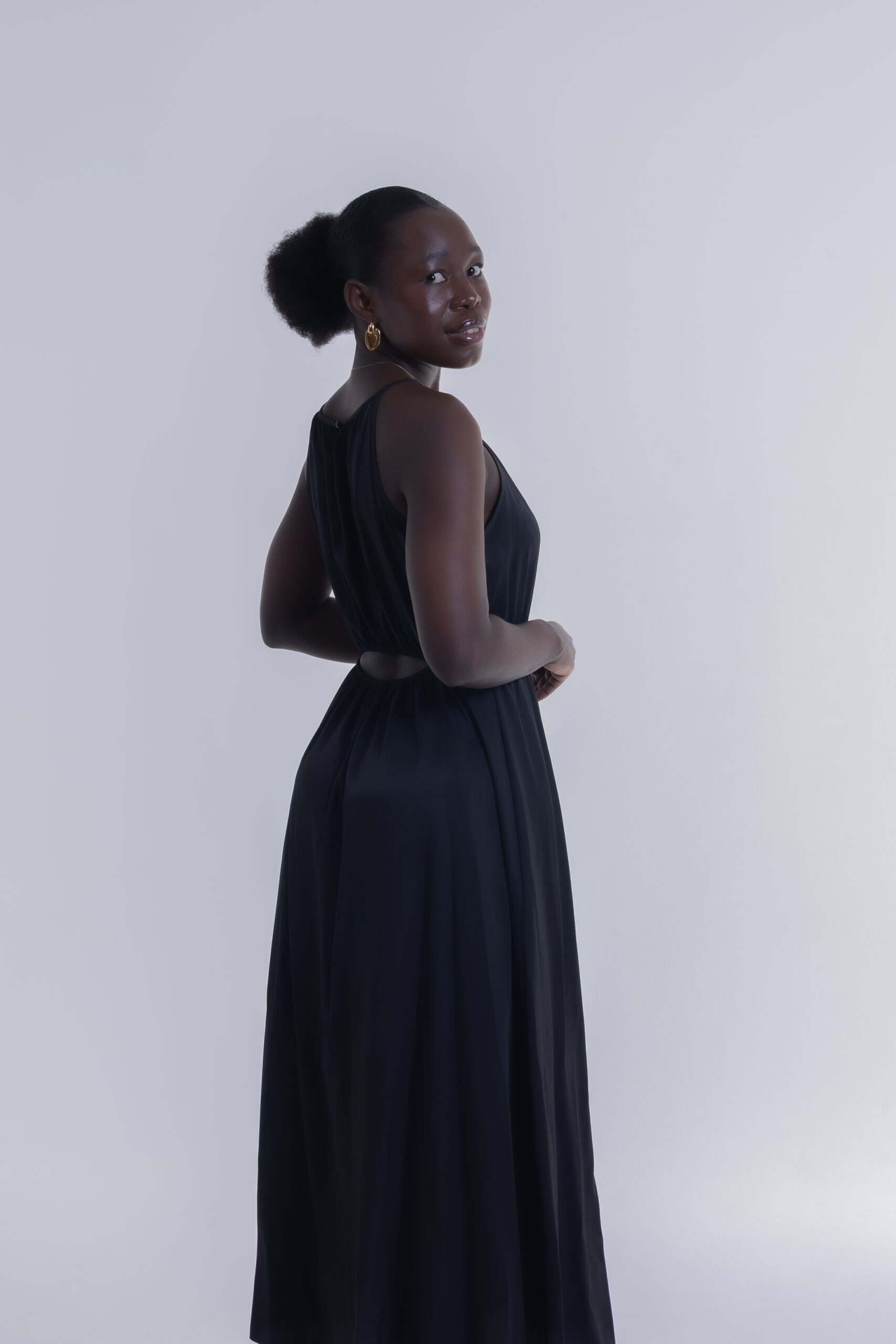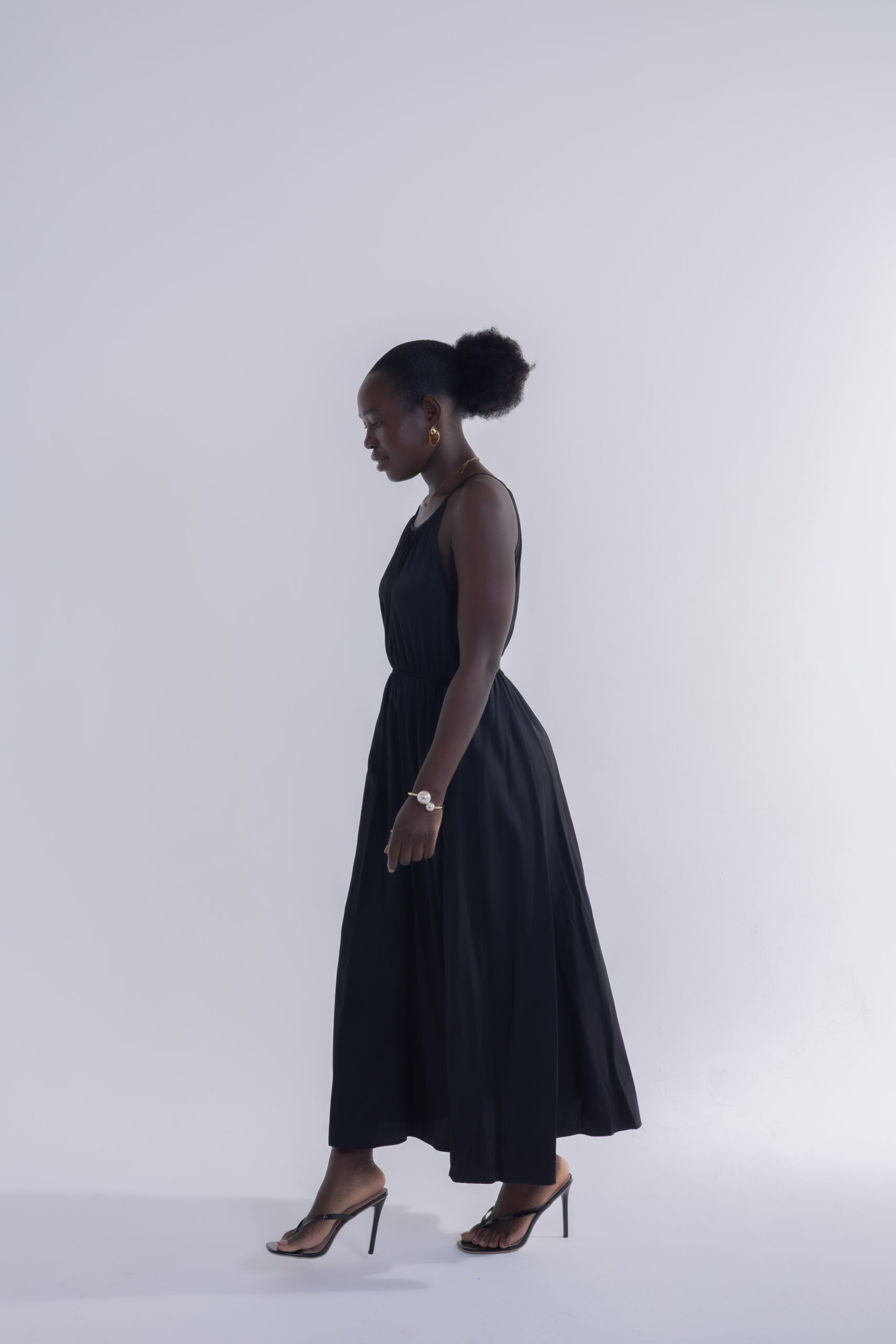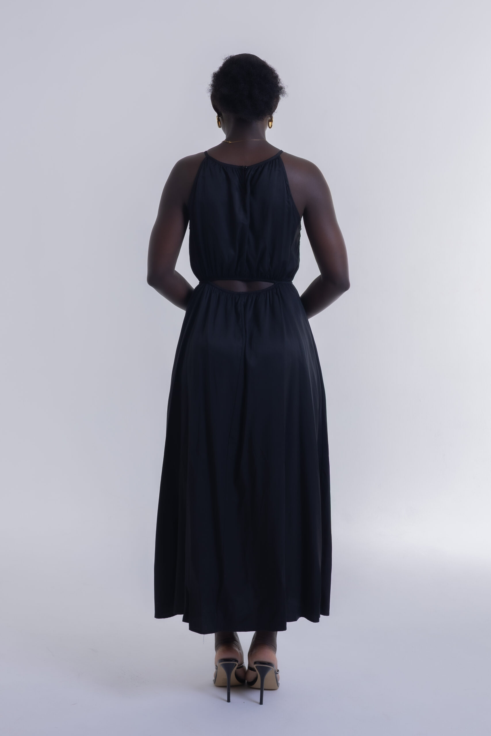 Gracefully minimal and light as air ,the axi dress features as softly gathered halter neckline and a cinched waist that flows into a breezy A-line skirt perfect for warm weather escape or a casual garden gatherings.