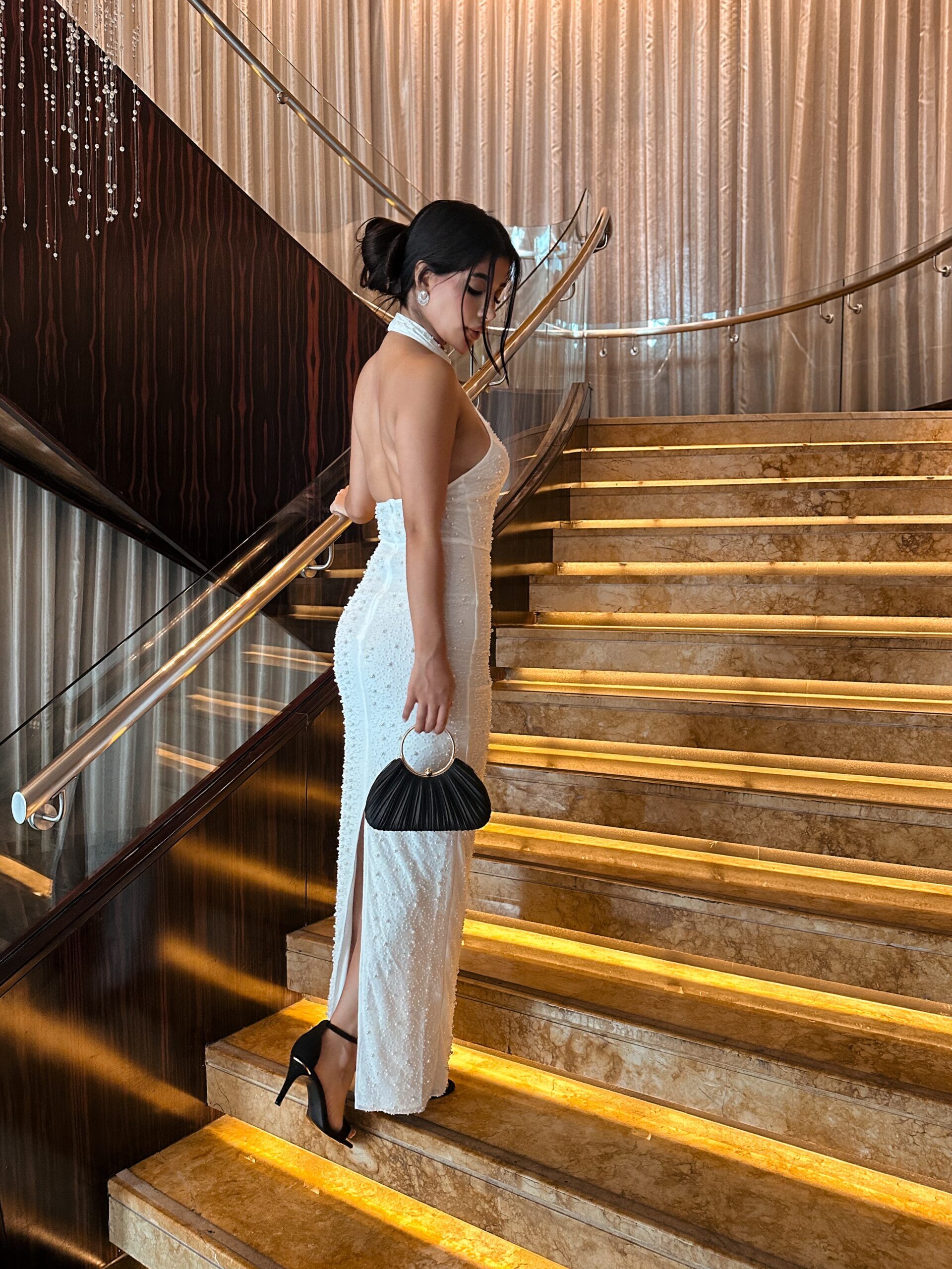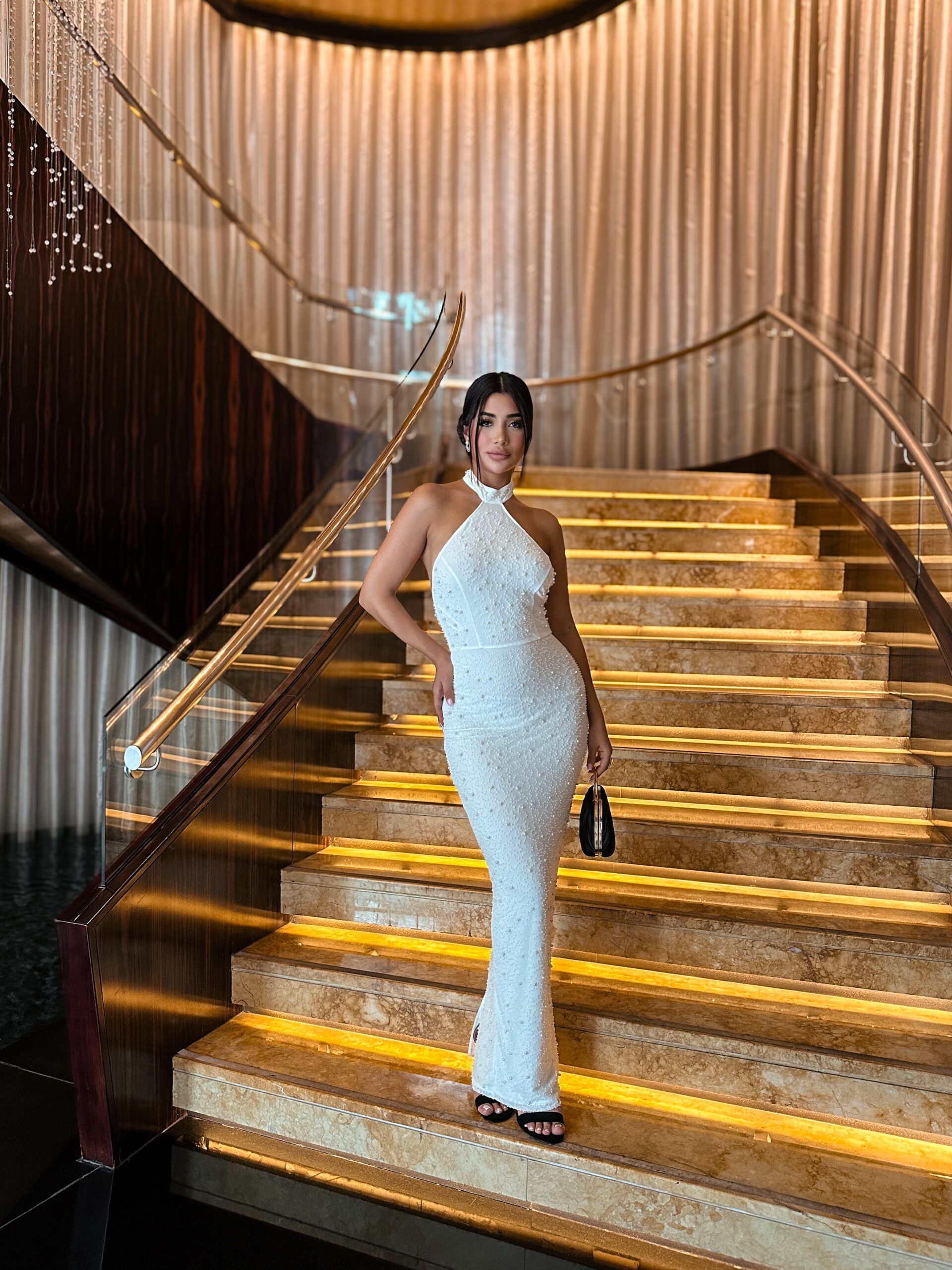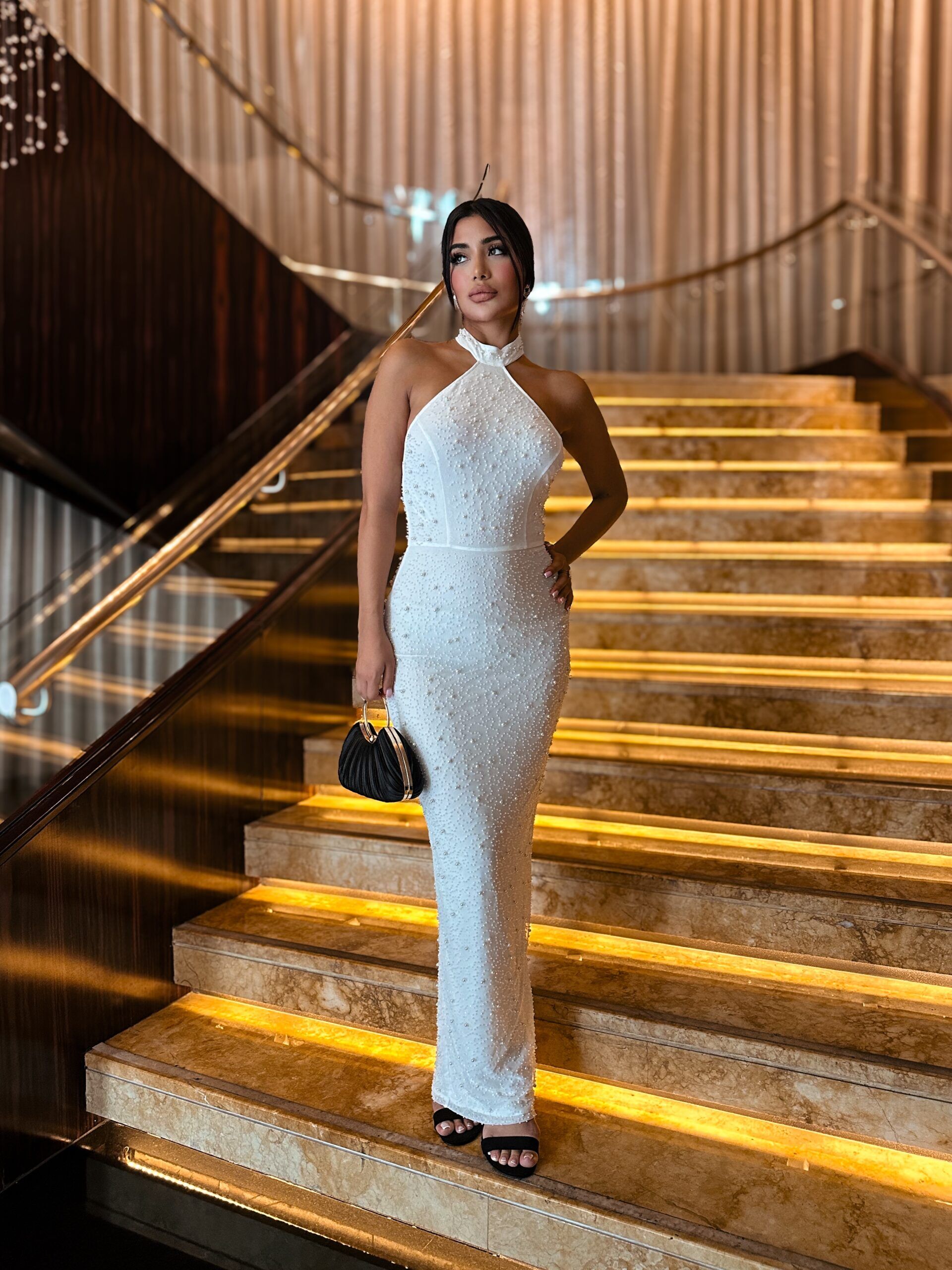 Command the room in the Crystal Frost Bodycon Gown, a dazzling high-neck masterpiece that sculpts the silhouette of with the show -stopping elegance .fully encrusted with clustered pearls and crystals, this sleeveless design contours every curve while shimmering underlight. The refined stretch fit and luxurious texture make it the perfect statement piece for upscale events, red carpets or bridal receptions.
