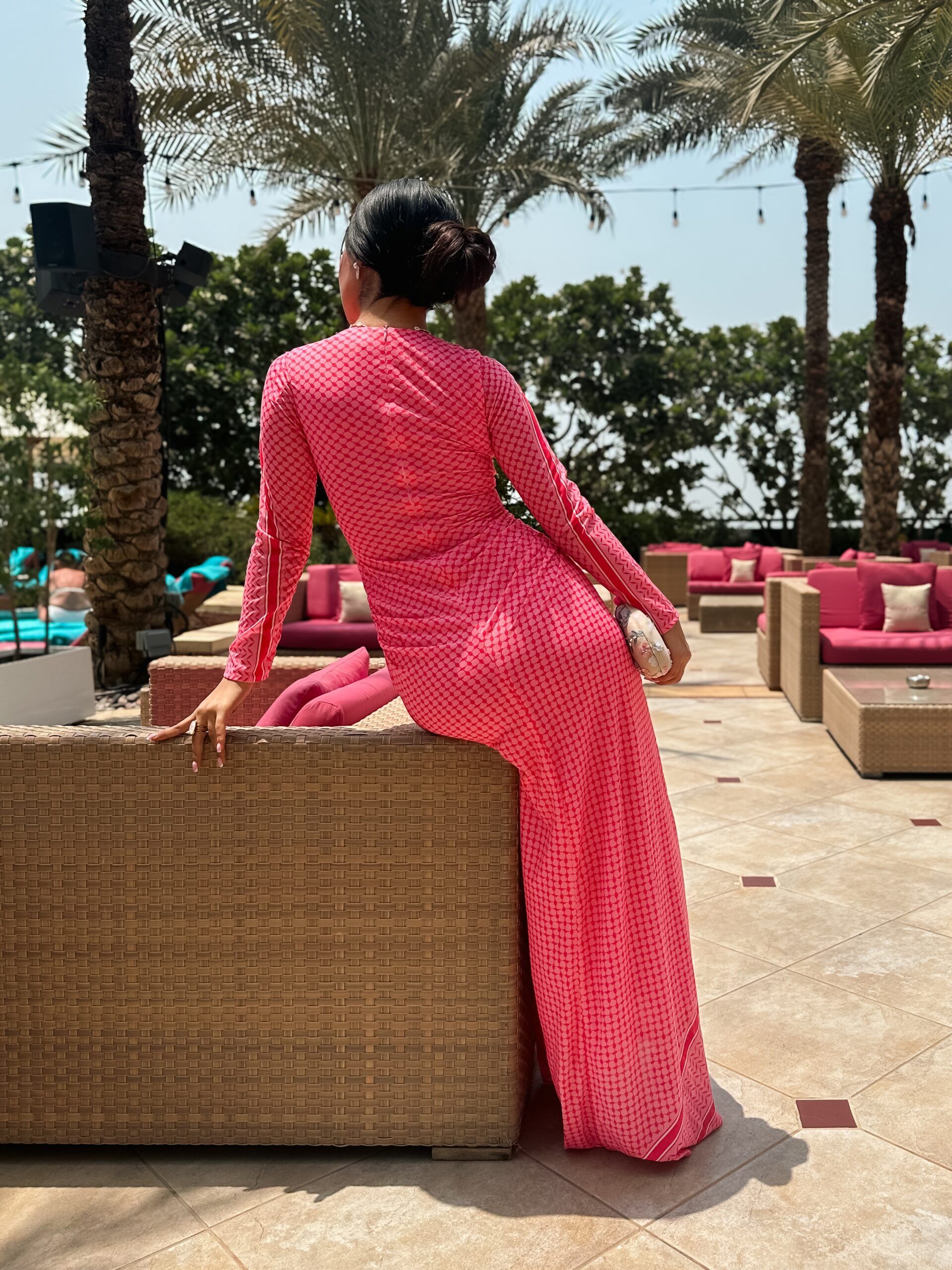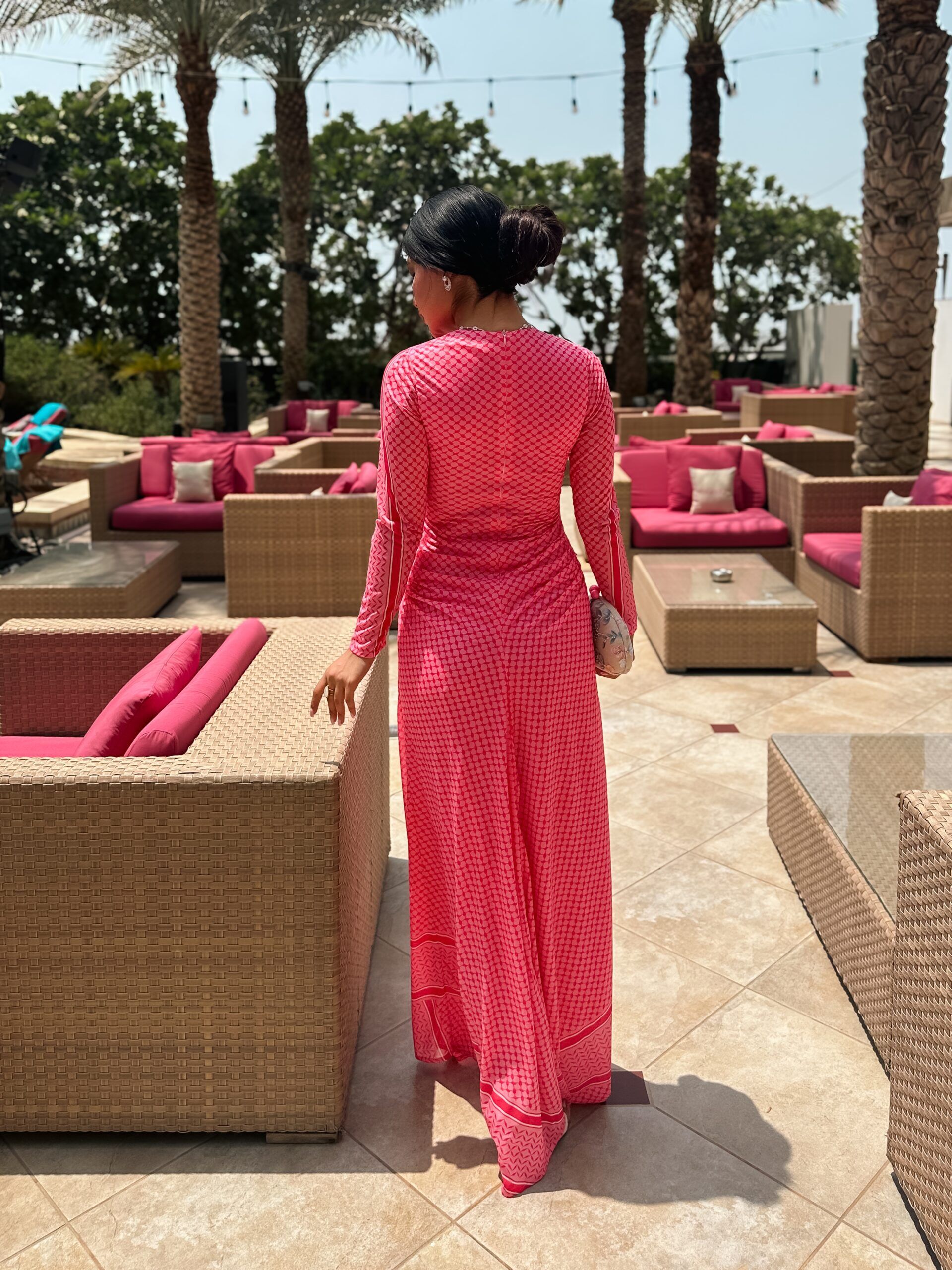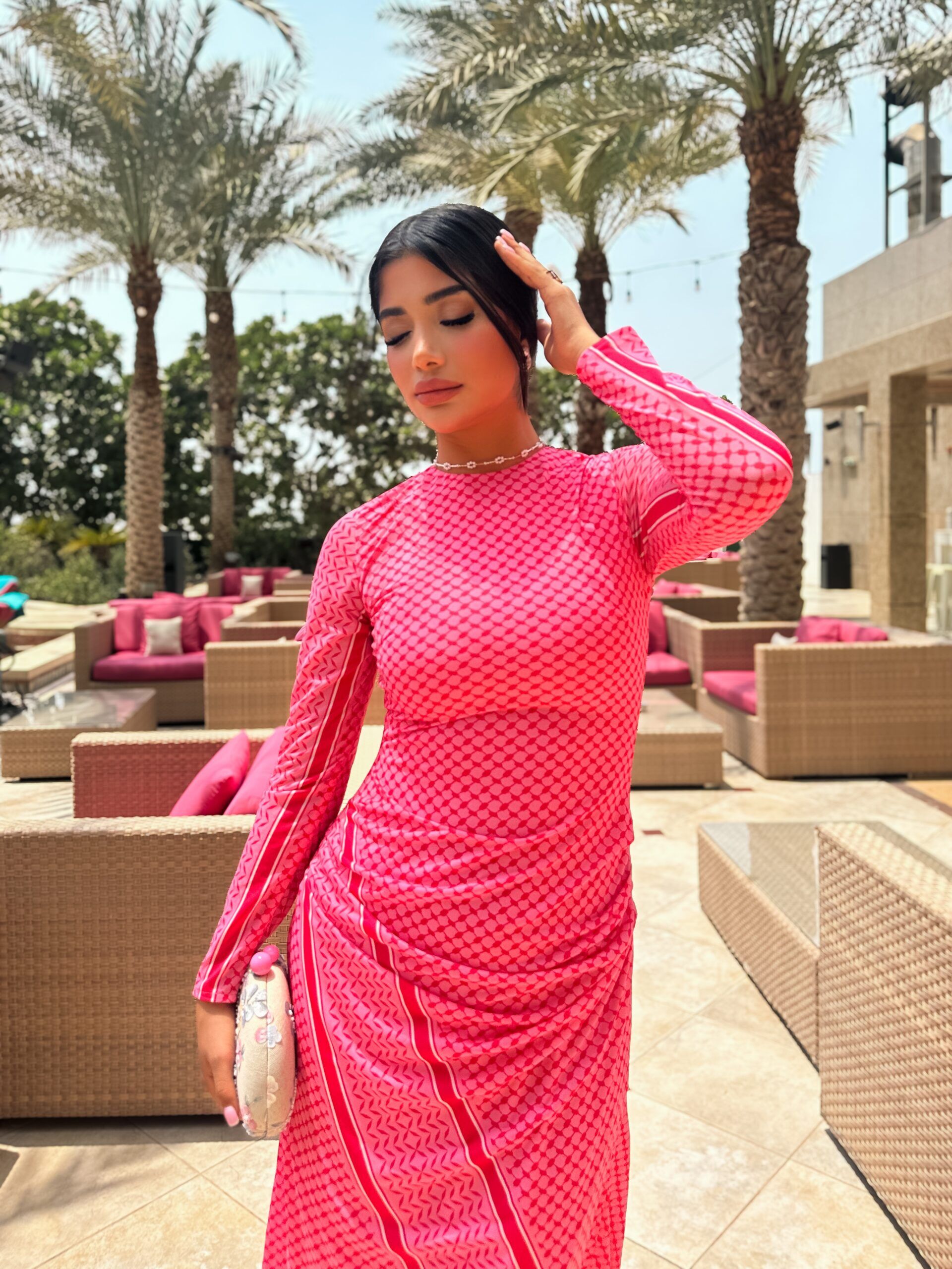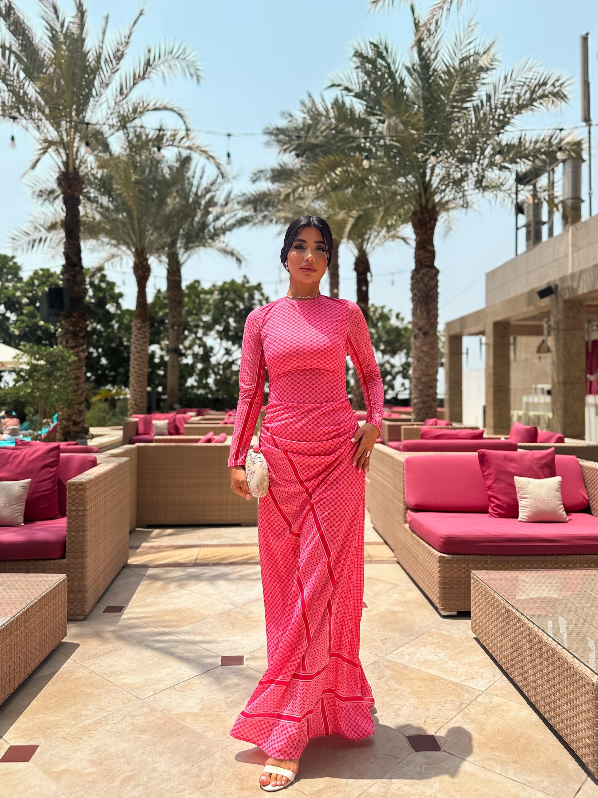 Turn heads with the Fuchsia Radiance Maxi,a vibrant full -length dress that celebrates confidence and feminine charm .Crafted in striking hot pink geometric print ,this gown combines boldness with elegance .The high neckline and long sleeves add a modest ,refined touch ,while the flowing maxi silhouette enhances movement and grace .Designed to hug the body in all the right places before cascading into a free- flowing hem,its perfect for evening gatherings or chic daytime events.