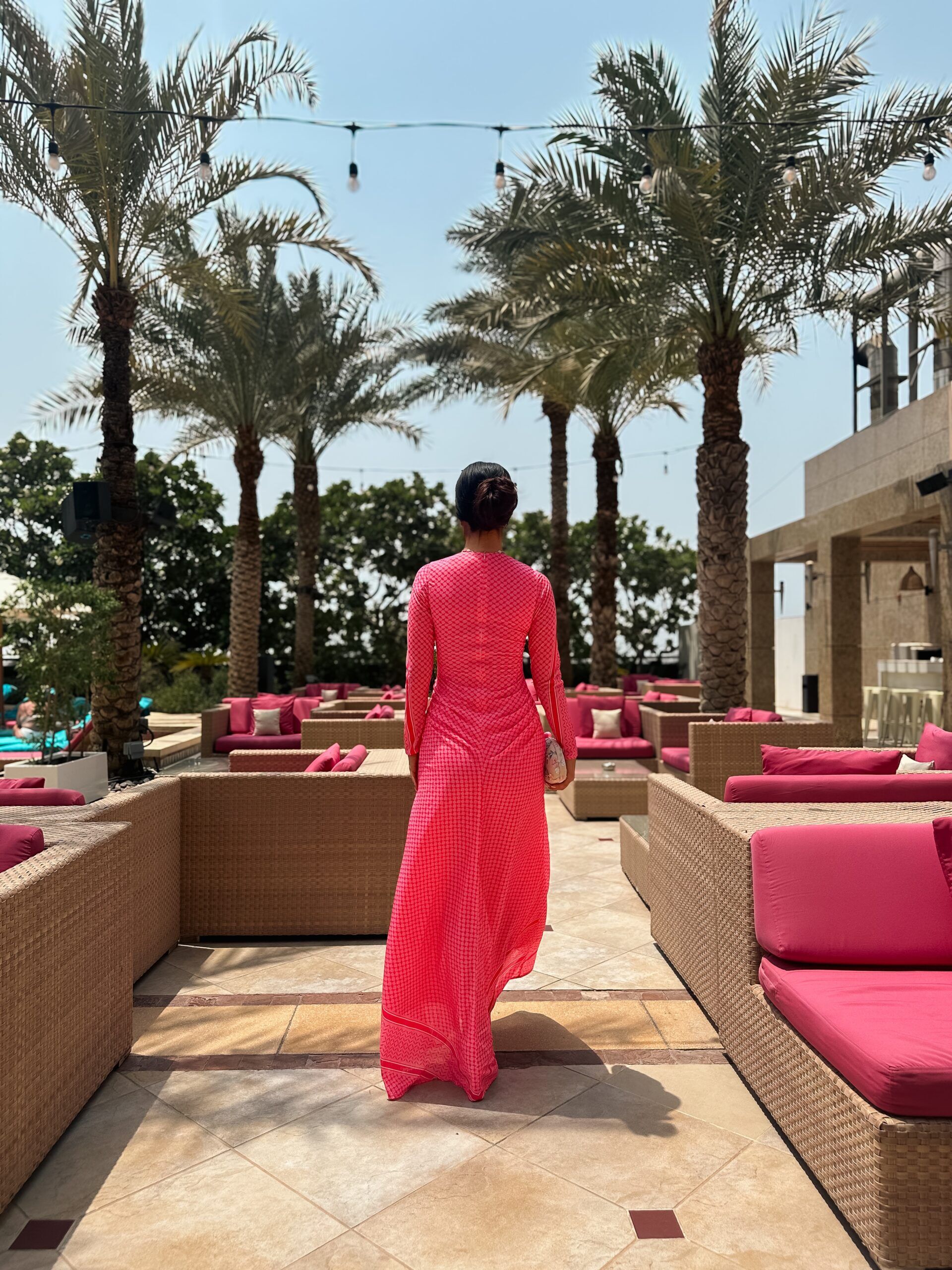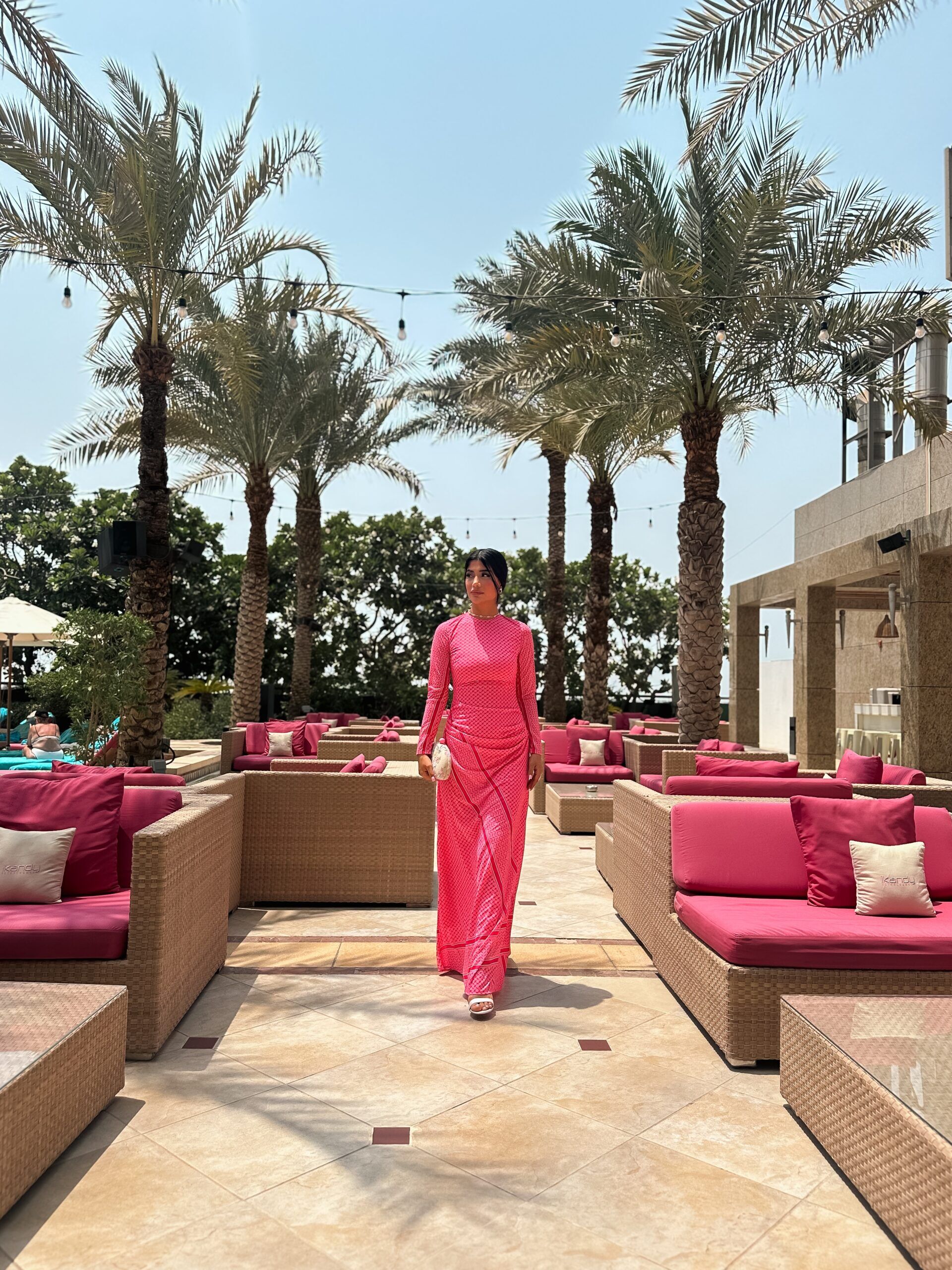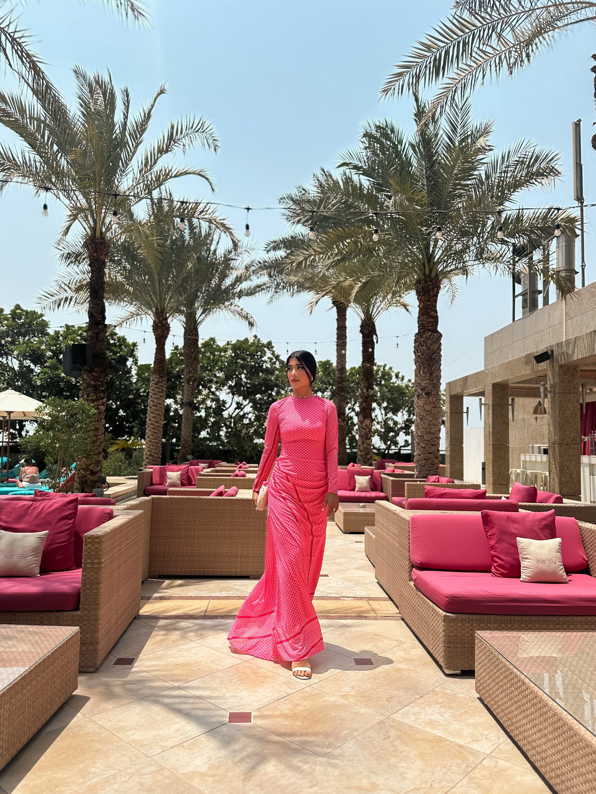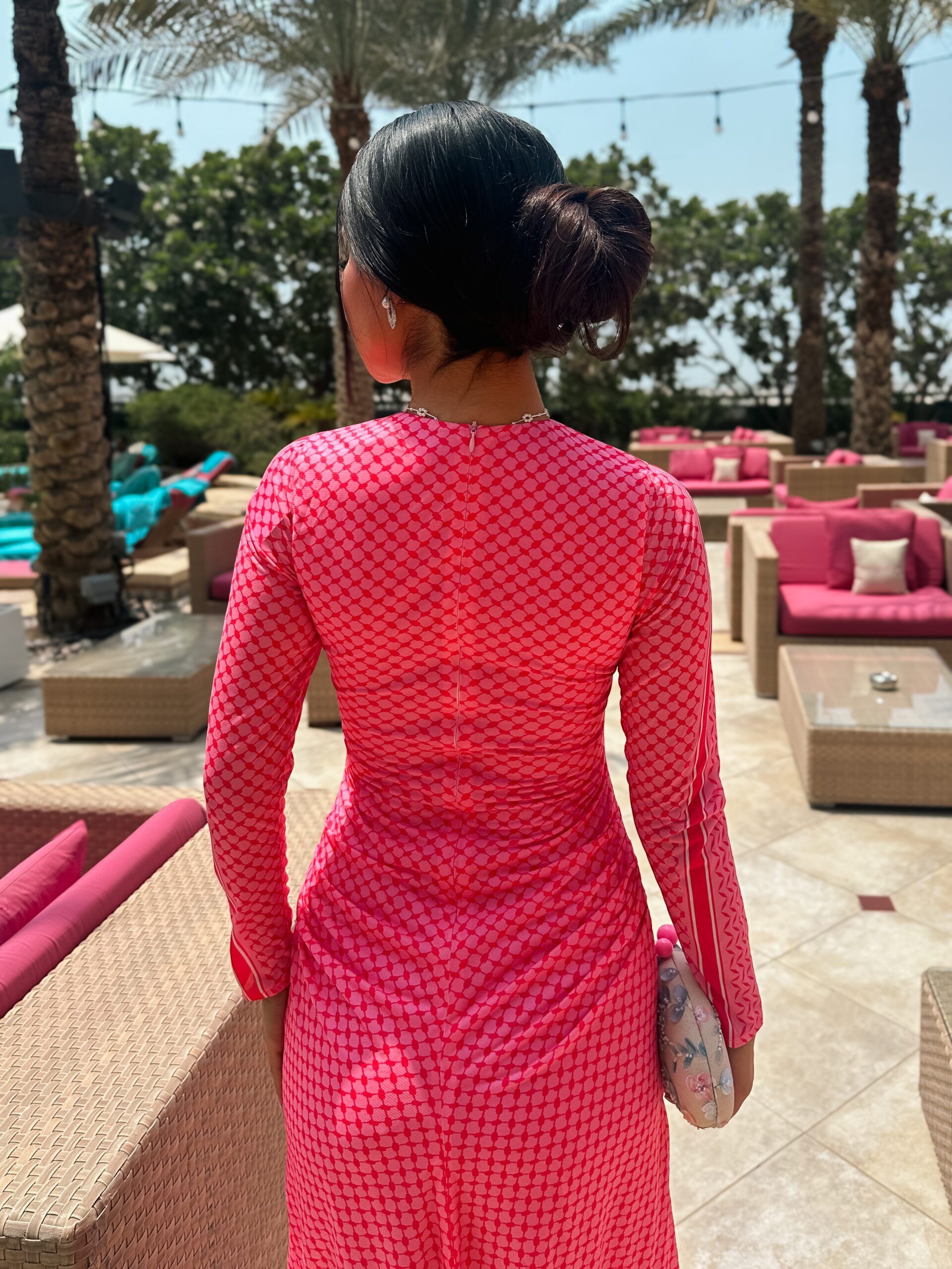 Turn heads with the Fuchsia Radiance Maxi,a vibrant full -length dress that celebrates confidence and feminine charm .Crafted in striking hot pink geometric print ,this gown combines boldness with elegance .The high neckline and long sleeves add a modest ,refined touch ,while the flowing maxi silhouette enhances movement and grace .Designed to hug the body in all the right places before cascading into a free- flowing hem,its perfect for evening gatherings or chic daytime events.