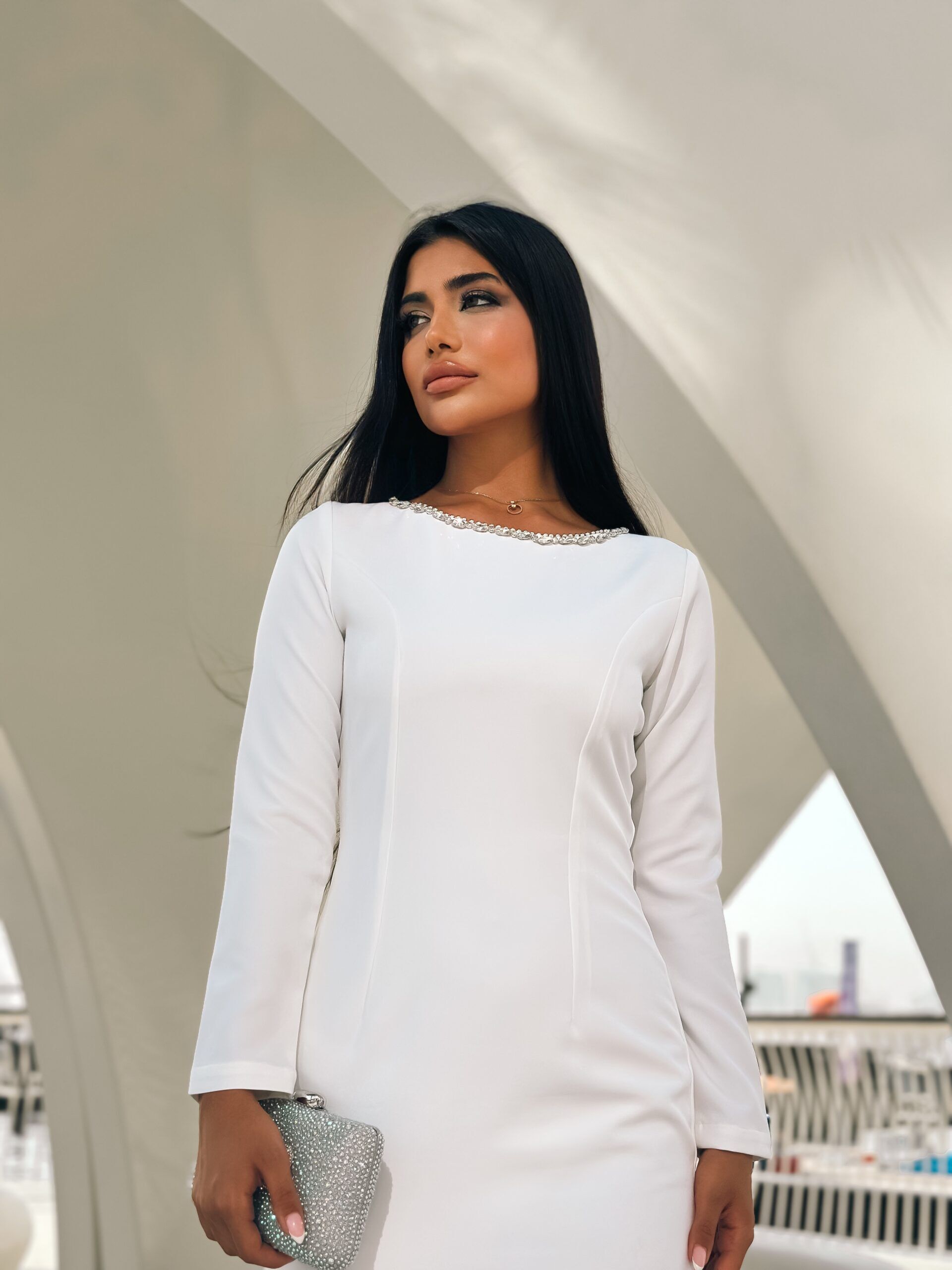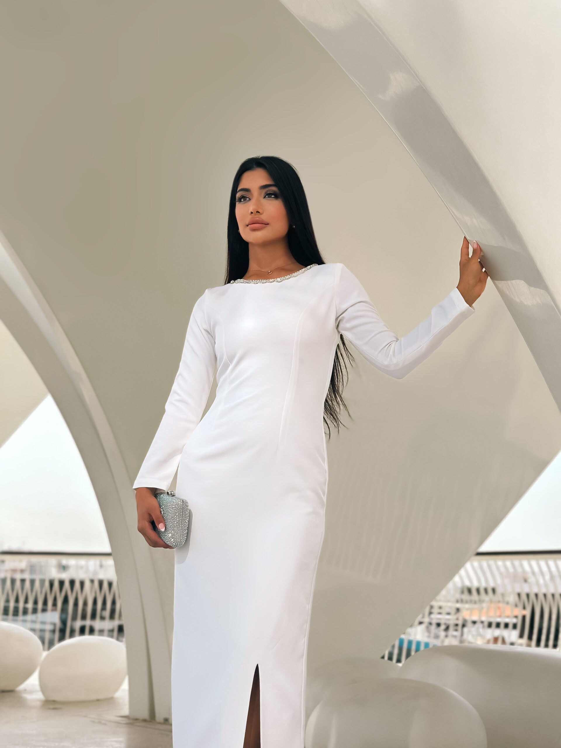 Pure white, elegant Round neck with sparkling stones, creating a highlight. Light, straight-cut dress, hugging the body. flattering. Long discreet sleeves, suitable for many formal occasions. Gentle front slit, adding charm. Smooth fabric, form fitting comfortable to wear.