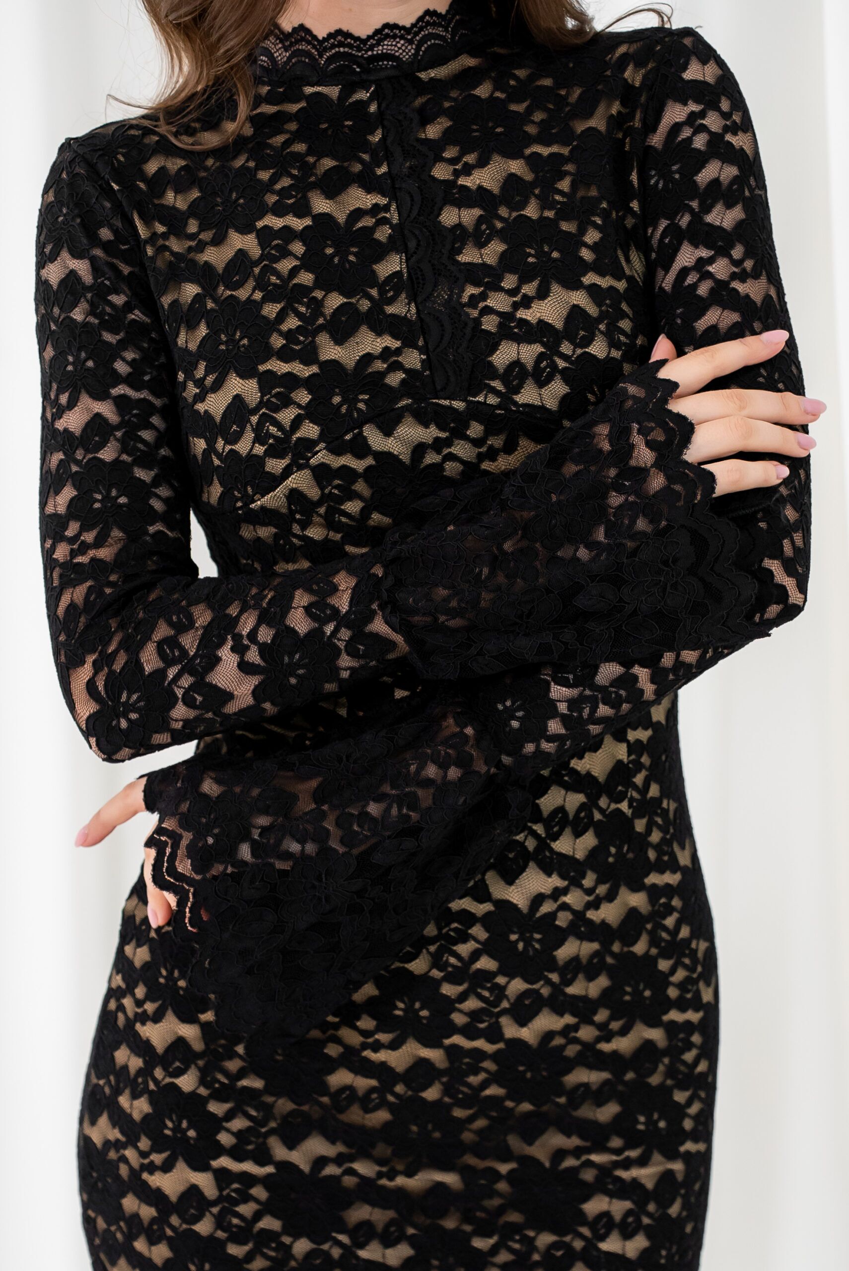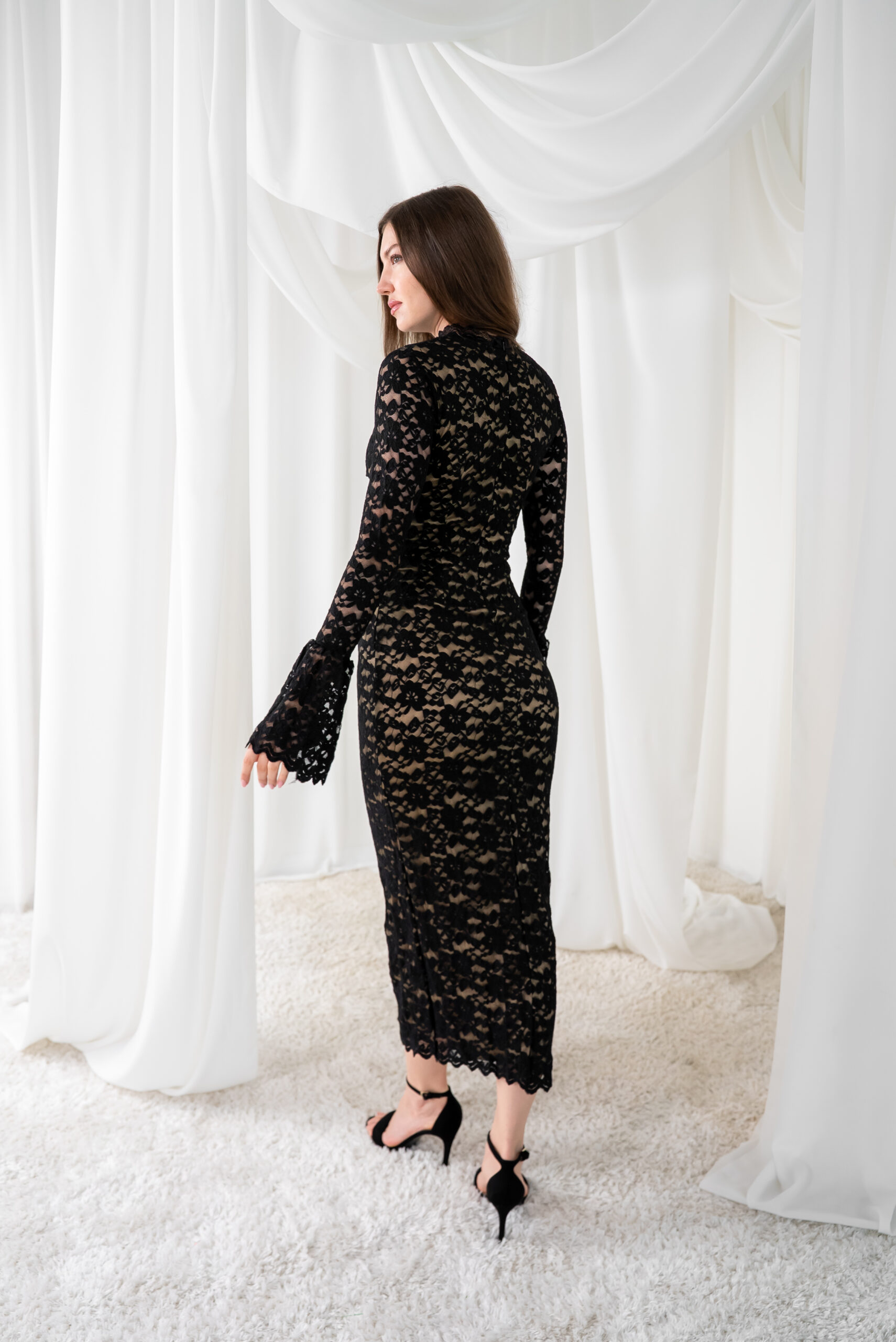 The Midnight Veil High-Neck Lace is a dramatic symphony of mystery and elegance. Crafted entirely from floral. black lace with a sheer overlay and nude underlay, this form-fitting silhouette features a high collar, flared cuffs and delicate scalloped edges with it’s vintage-inspired charm and modern sensuality.