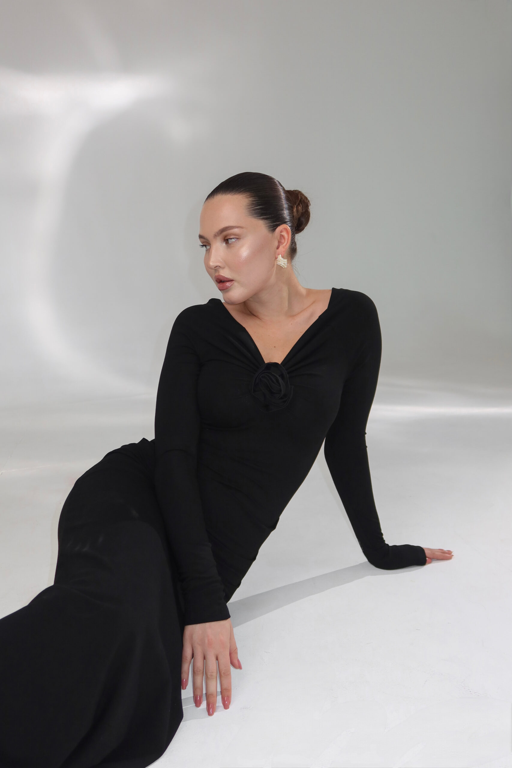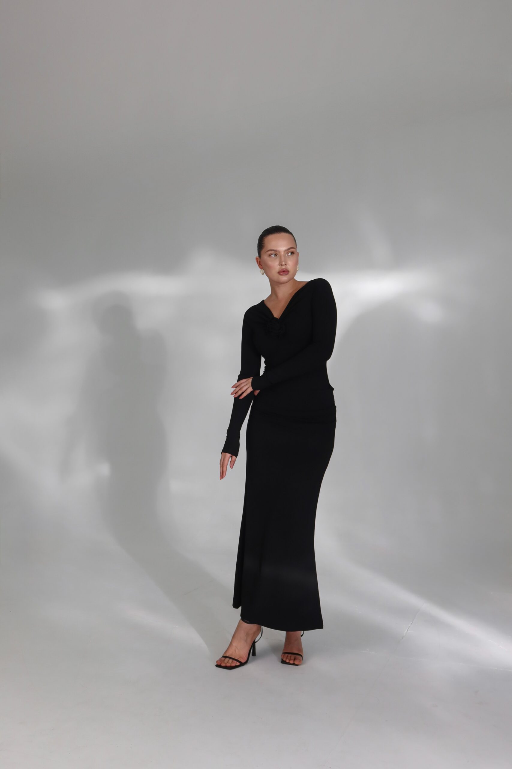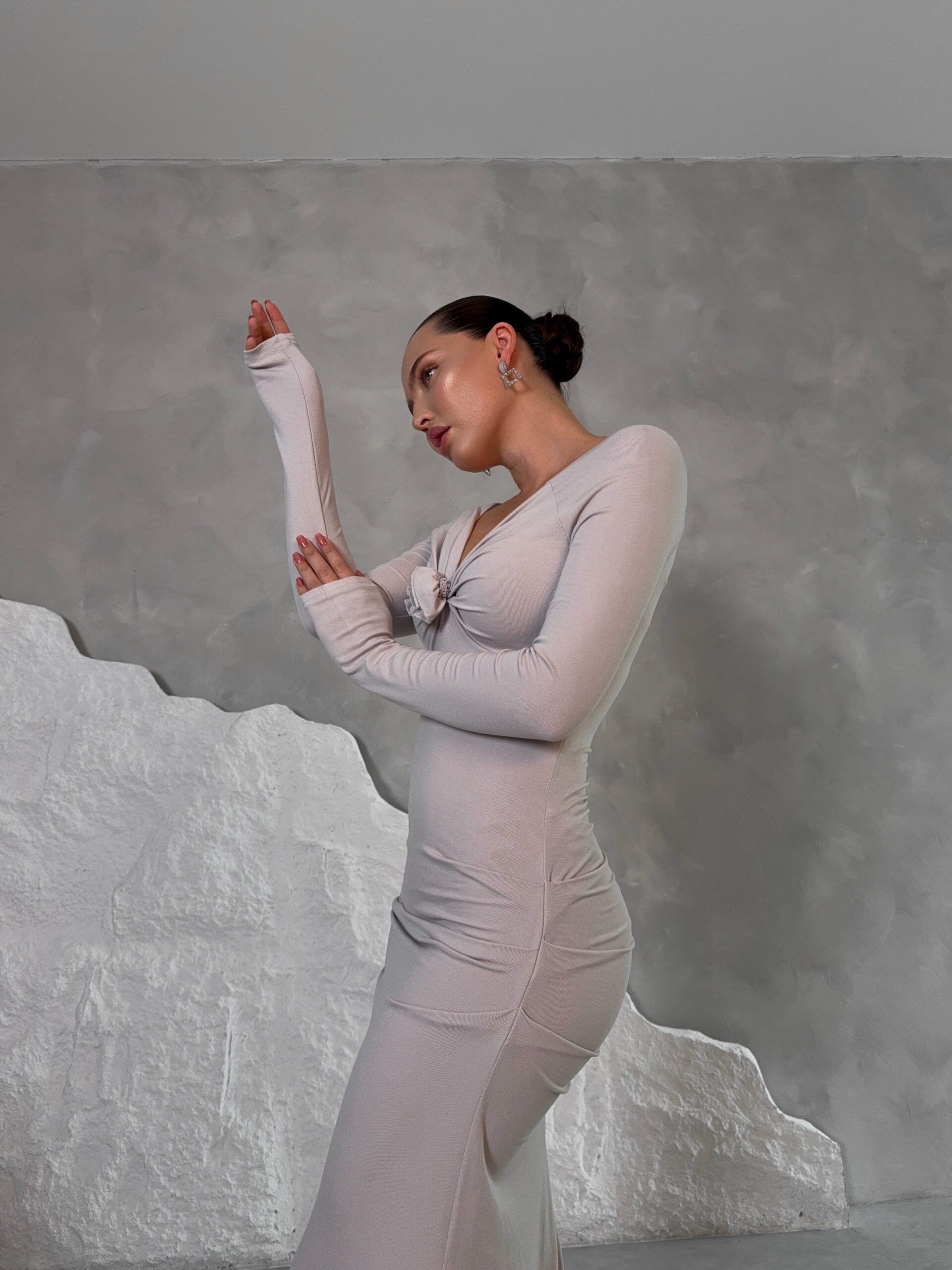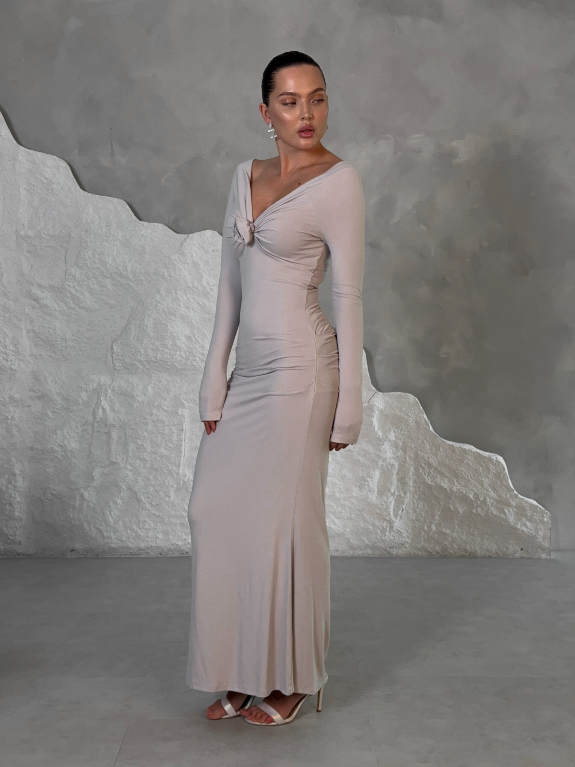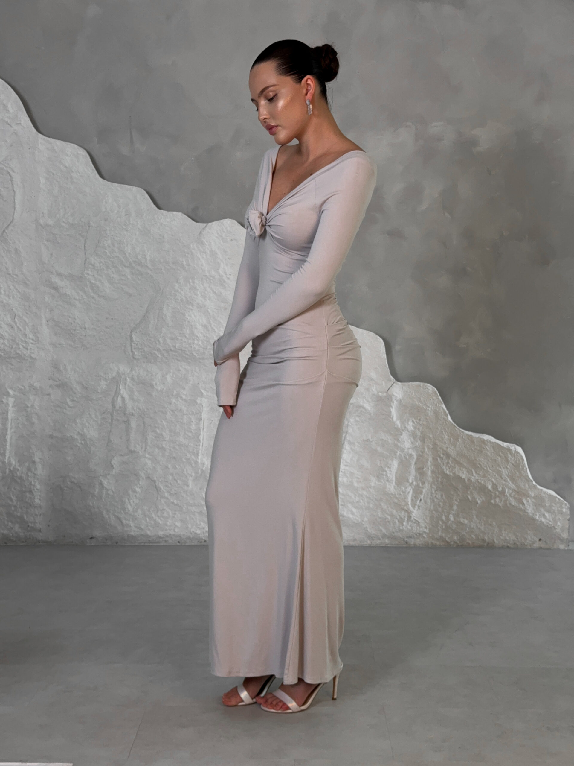 The moonlight petal off-shoulder Gown embodies refined elegance with a soft, modern edge. Designed in a delicate dove gray tone, this floor-length gown features a gathered, off the shoulder neckline and ruched bodice that flatters the figure, the long sleeves add sophistication, while a sculpted rosette at the bust offers a romantic focal point.