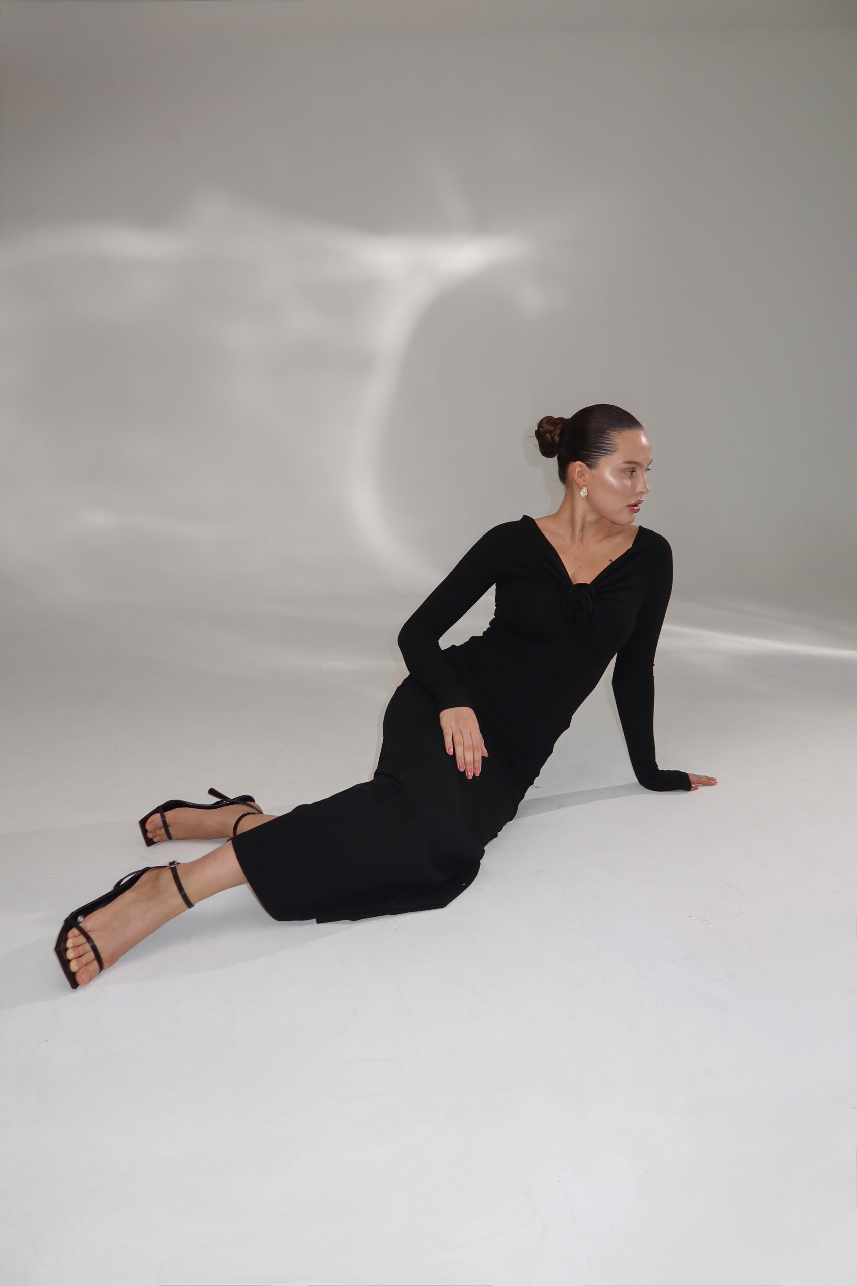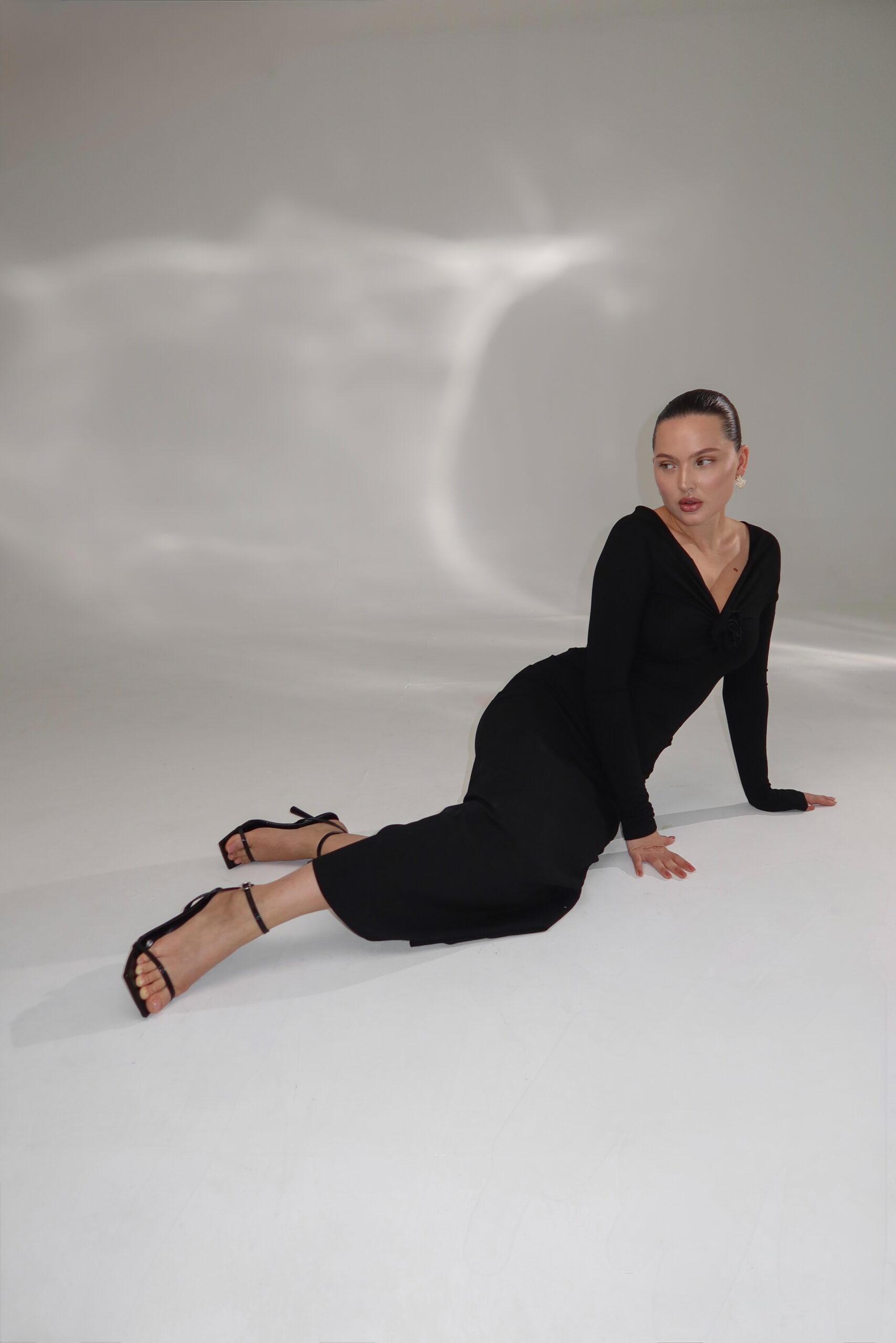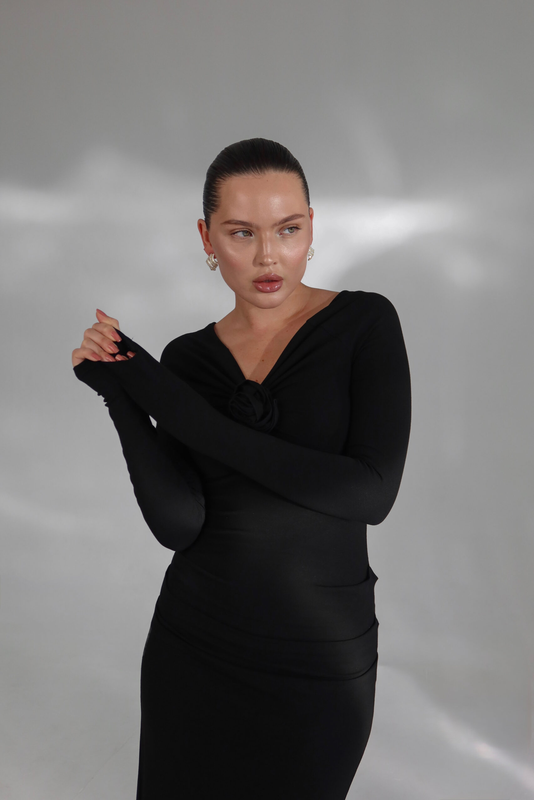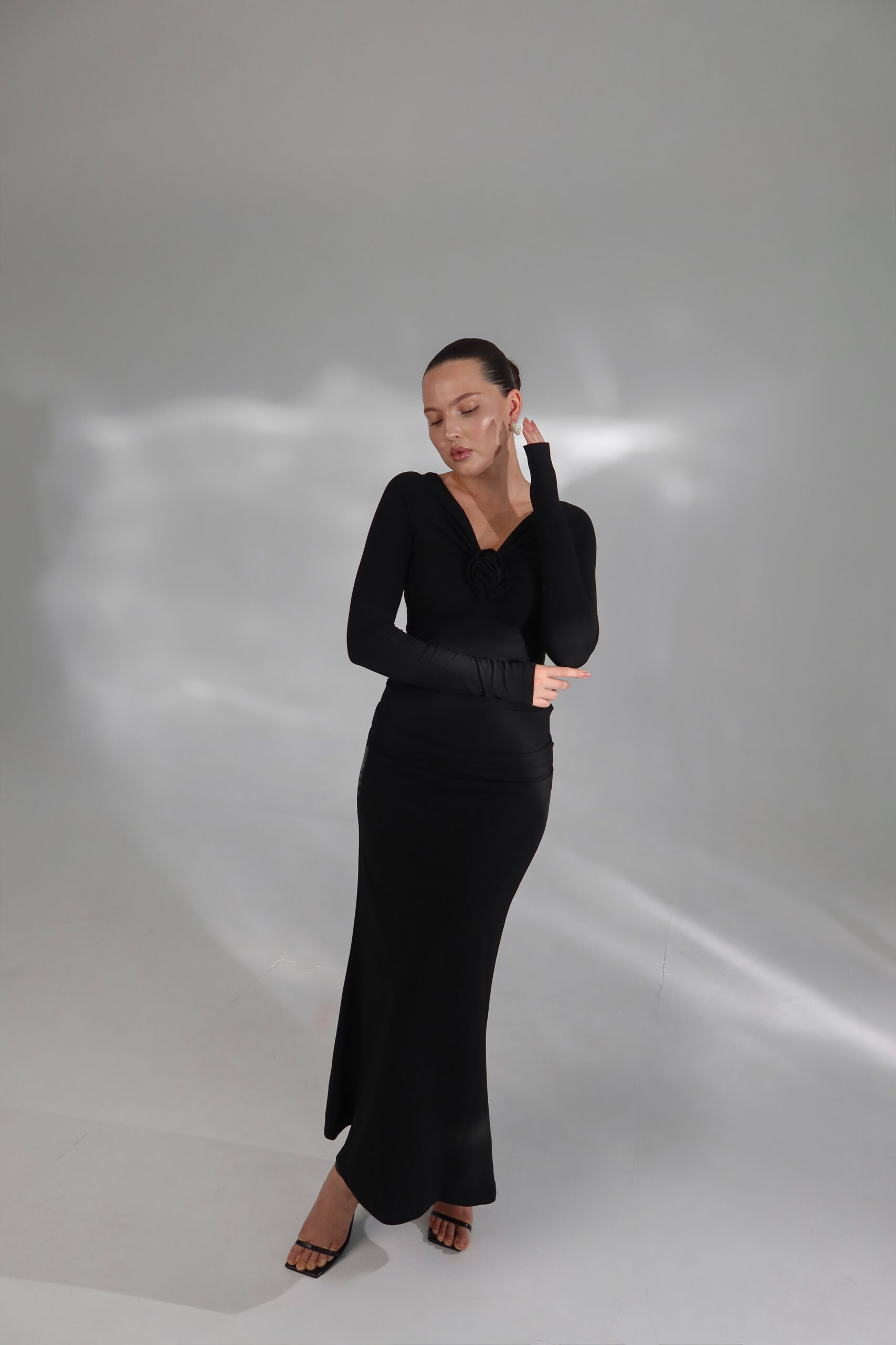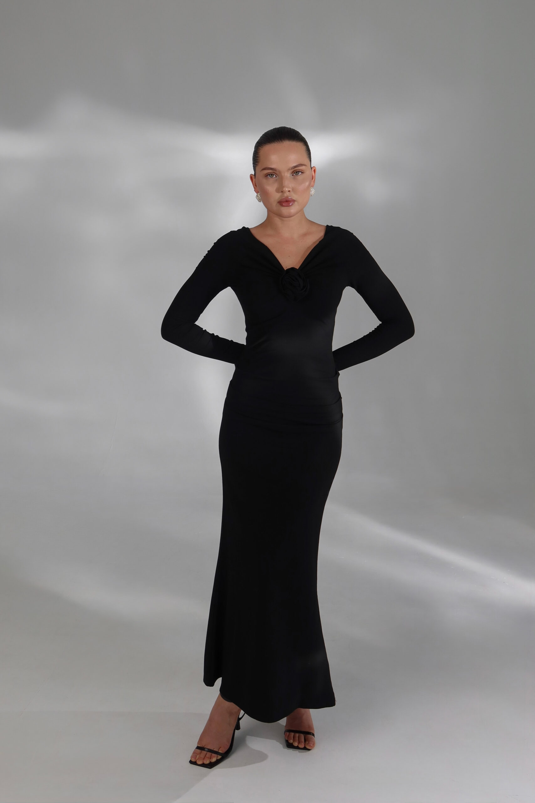 The moonlight petal off-shoulder Gown embodies refined elegance with a soft, modern edge. Designed in a delicate dove gray tone, this floor-length gown features a gathered, off the shoulder neckline and ruched bodice that flatters the figure, the long sleeves add sophistication, while a sculpted rosette at the bust offers a romantic focal point.