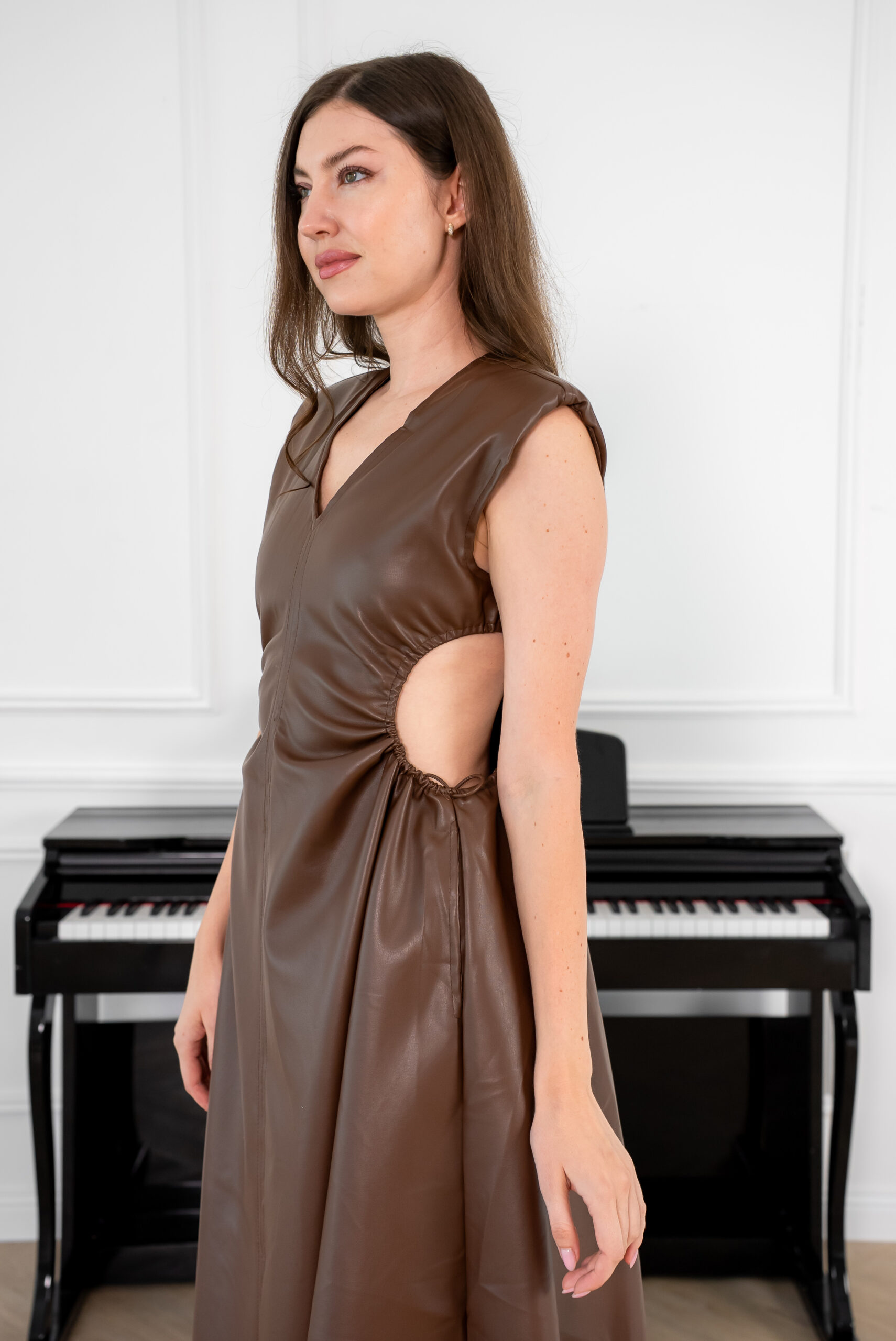 A bold fusion of edge and elegance, this sleeveless black midi dress is crafted from structure hard leather, featuring a sleek A-line precision-cut side openings tied with minimalist leather laces. The deep V neckline adds a refined contrast to the dress’s sculptural form, creating a look thats both modern and daring.