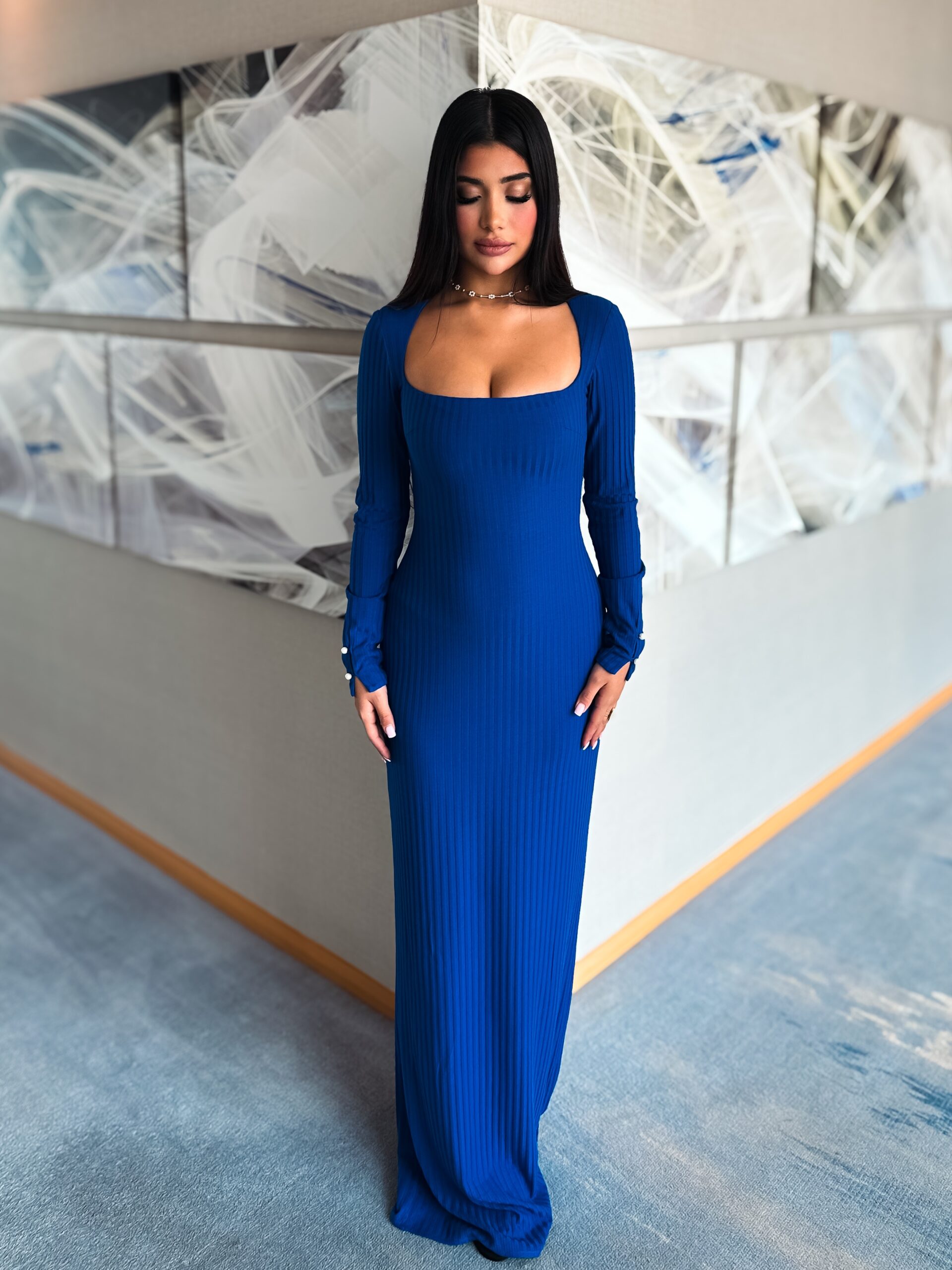The Velora Square – Neck Maxi is the embodiment of timeless sophistication .Designed with a sleek ,body-contouring silhouette ,this grown features a bold square neck-line that frames the decolletage with modern elegance.Crafted from a ribbed stretch fabric ,The long fitted sleeves,detailed with chic button cuffs ,and a subtle touch of refinement. Falling gracefully to the floor, this dress is the perfect balance of minimalism and allure -ideal for evening soirees,formal dinners ,or upscale gatherings.