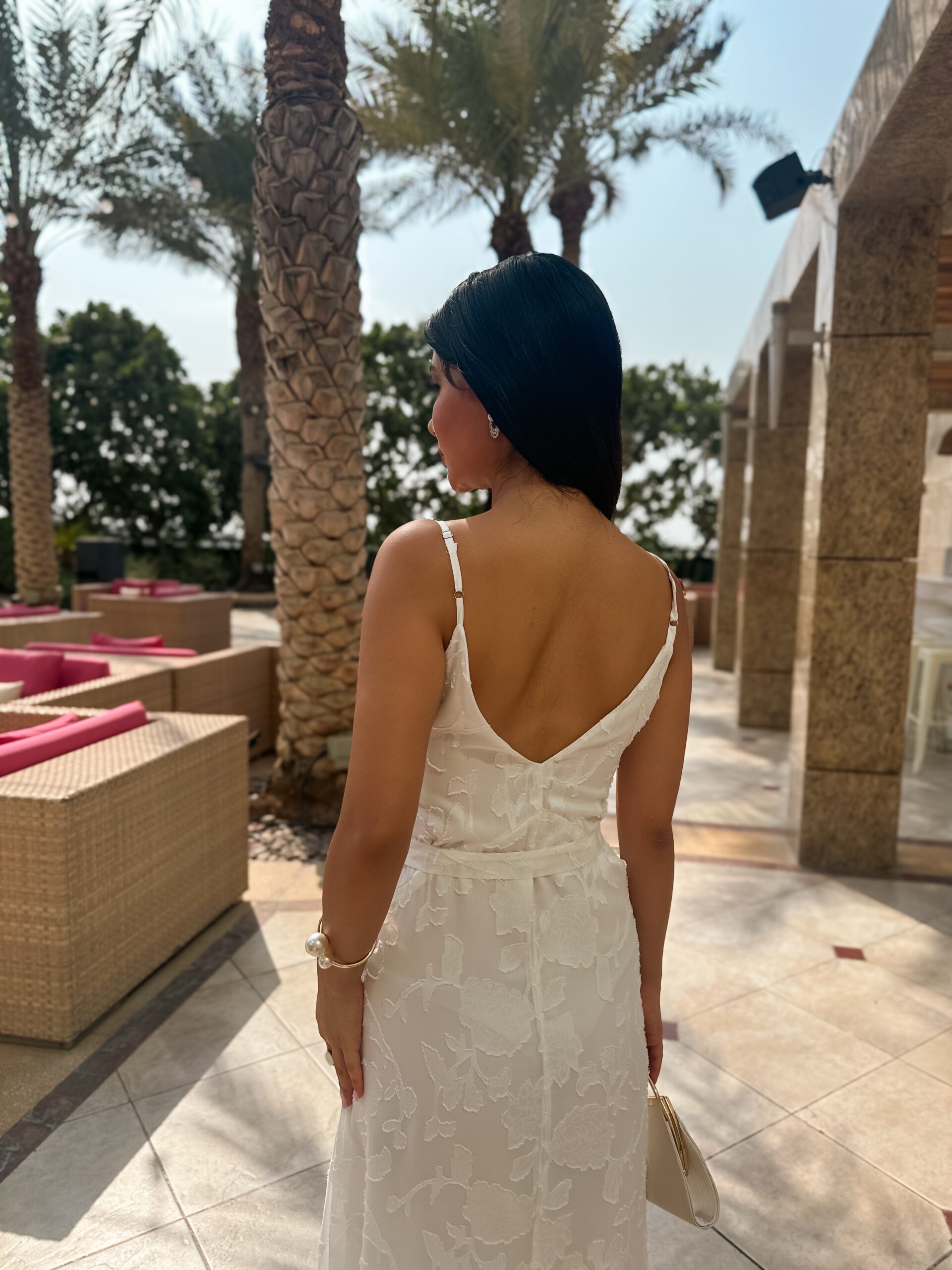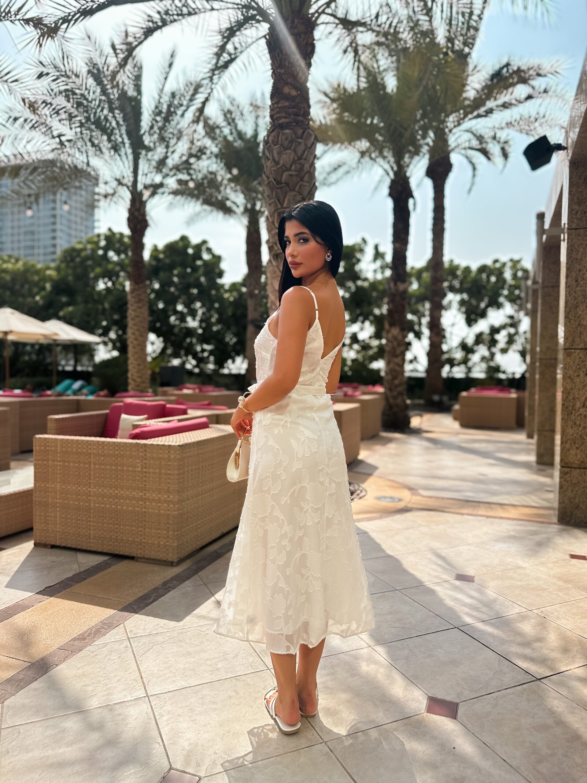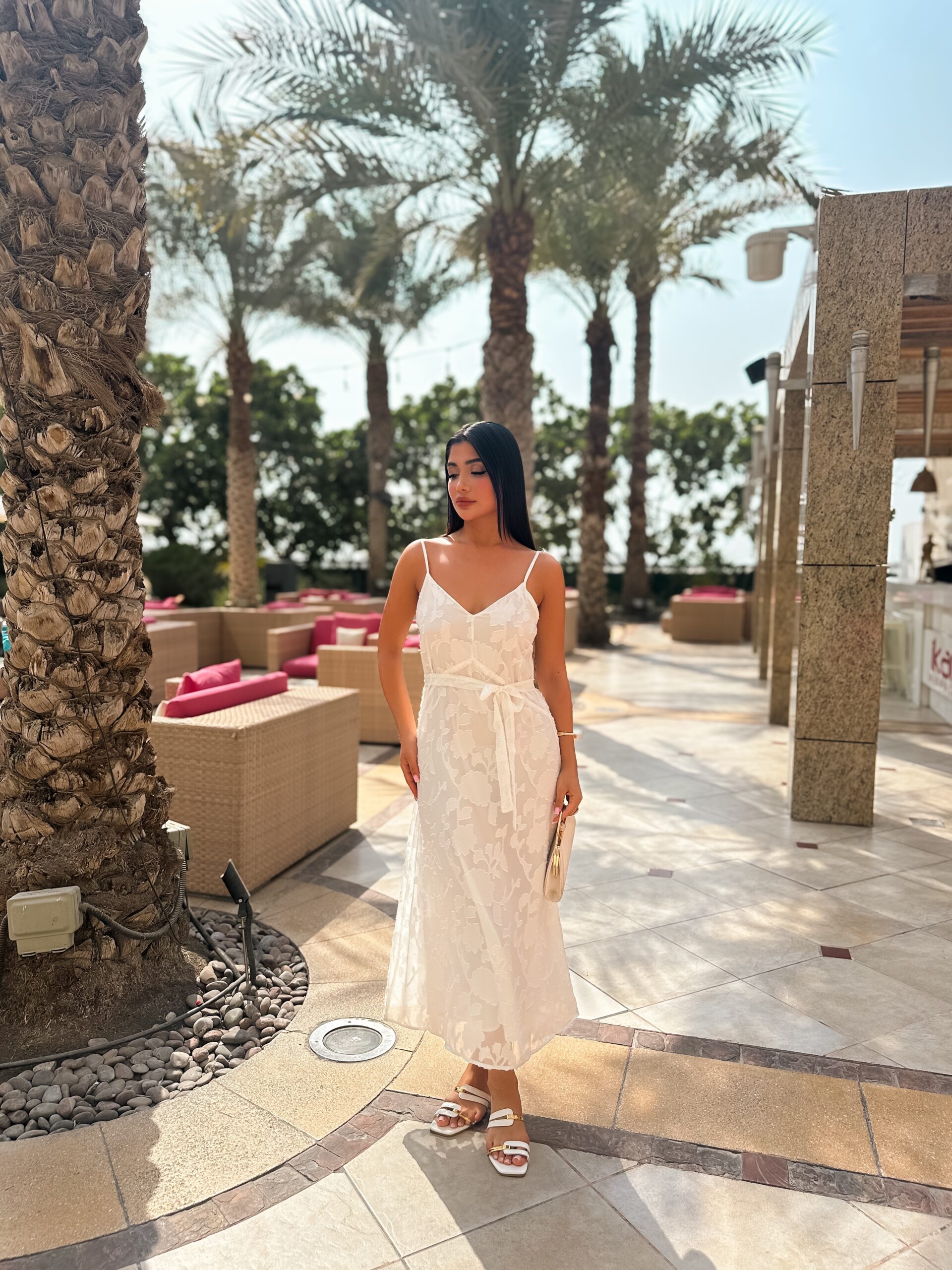 Ethereal and effortlessly elegant, this midi dress features delicate floral lace embroidery over a sheer base. With its soft V- neckline, adjustable straps and a subtle cinched waist, it exudes femininity and grace-perfect for summer soirees.
