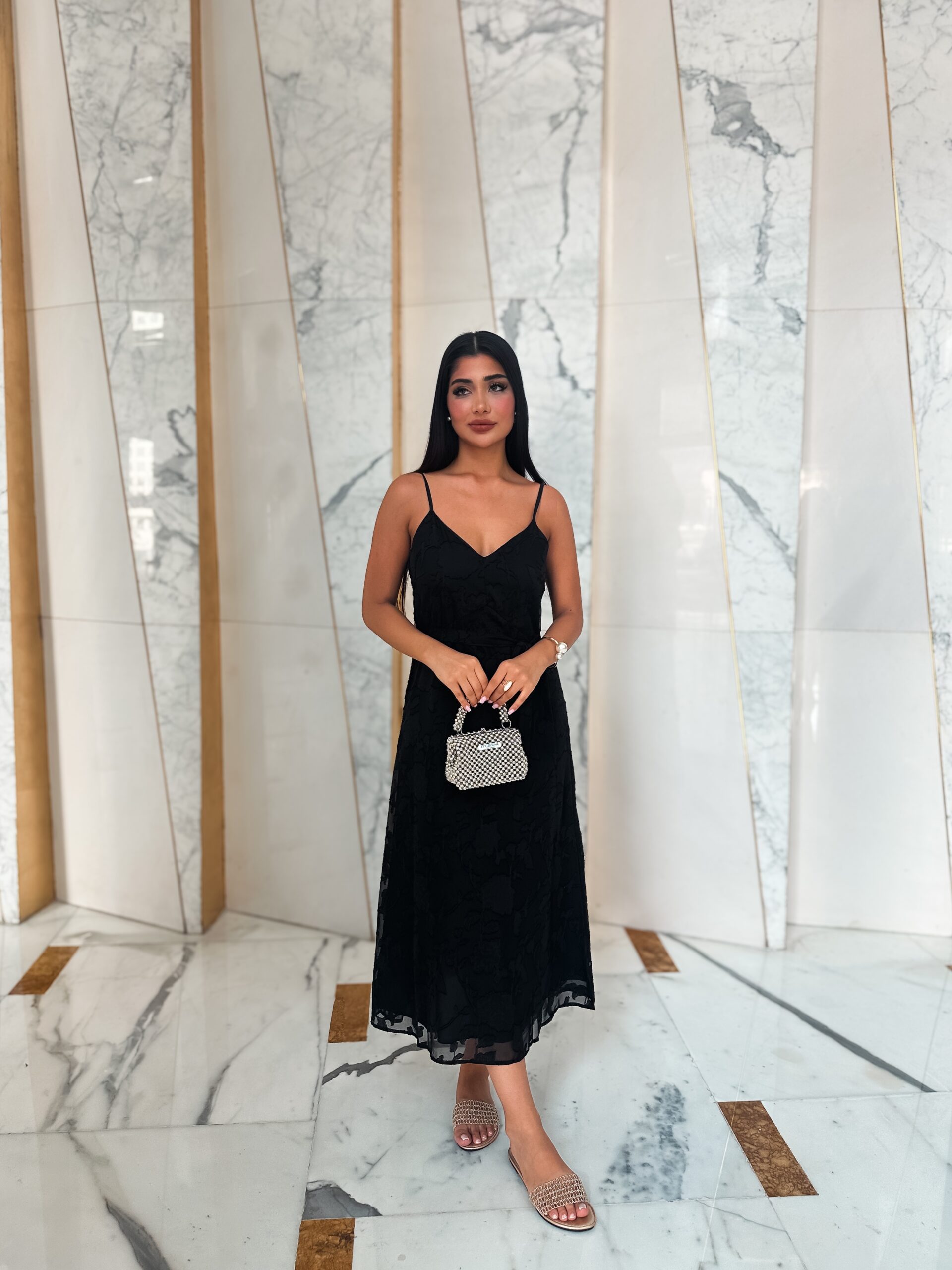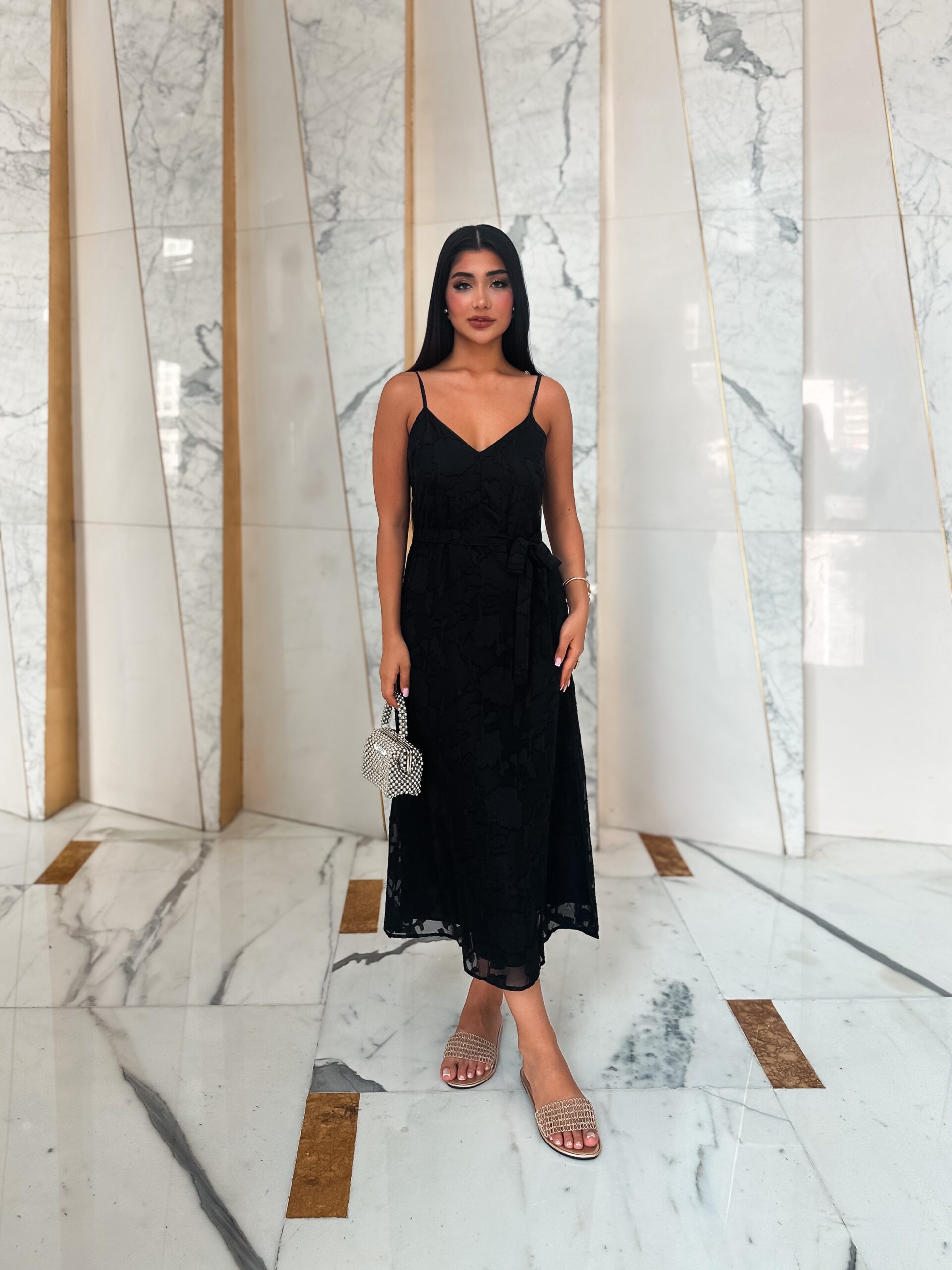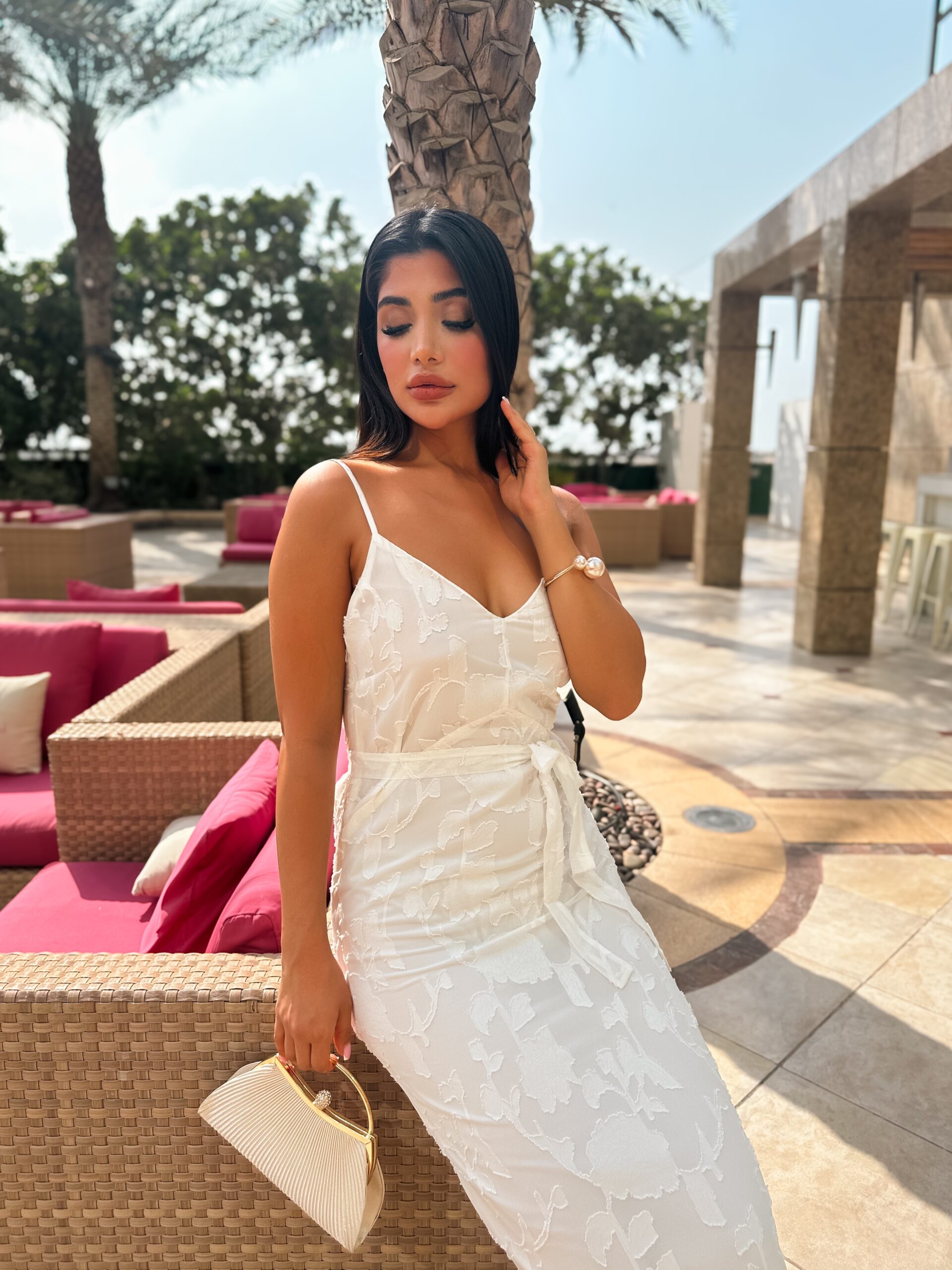 Ethereal and effortlessly elegant, this midi dress features delicate floral lace embroidery over a sheer base. With its soft V- neckline, adjustable straps and a subtle cinched waist, it exudes femininity and grace-perfect for summer soirees.