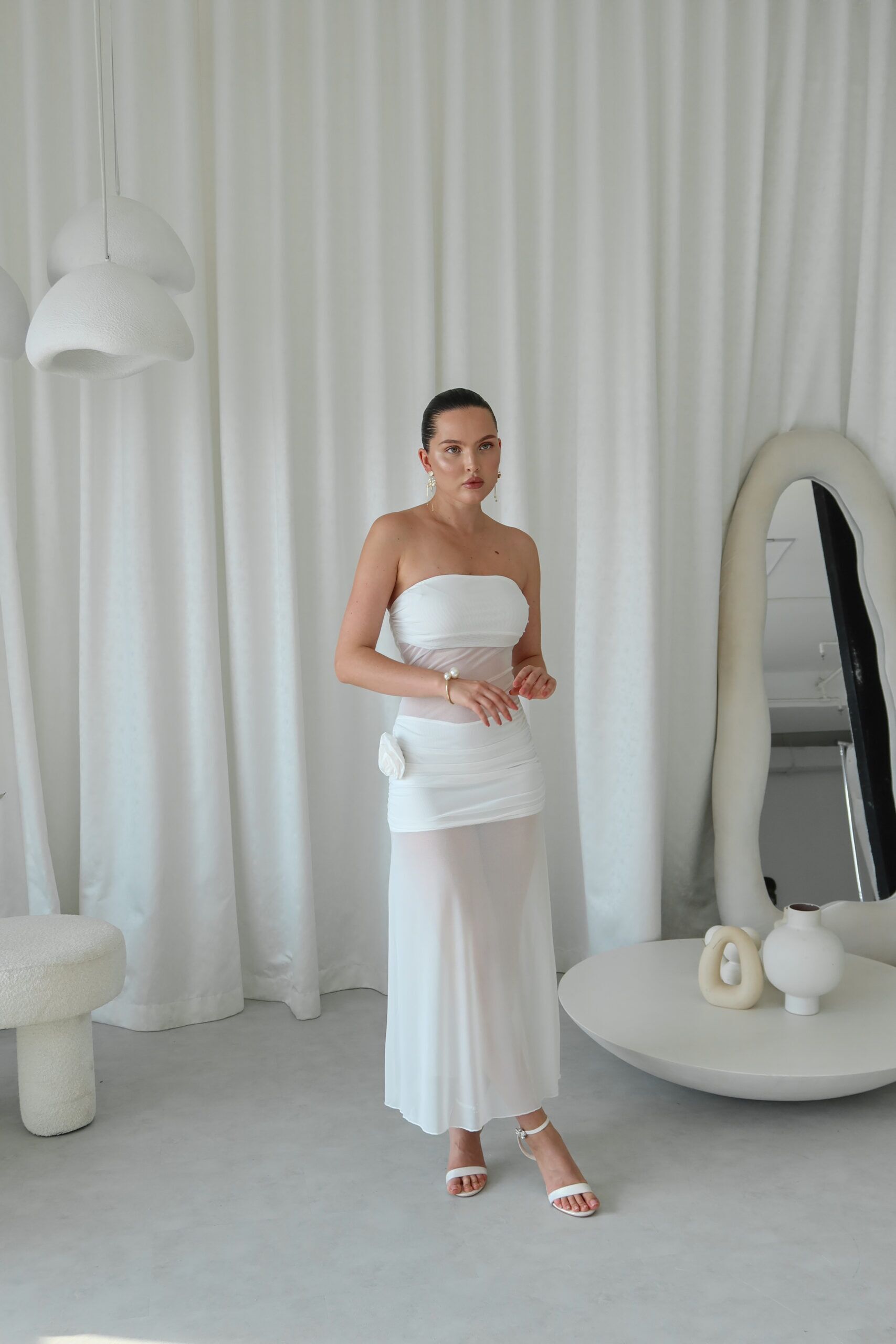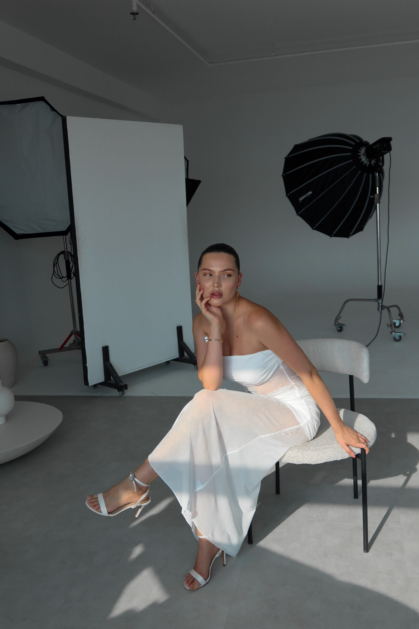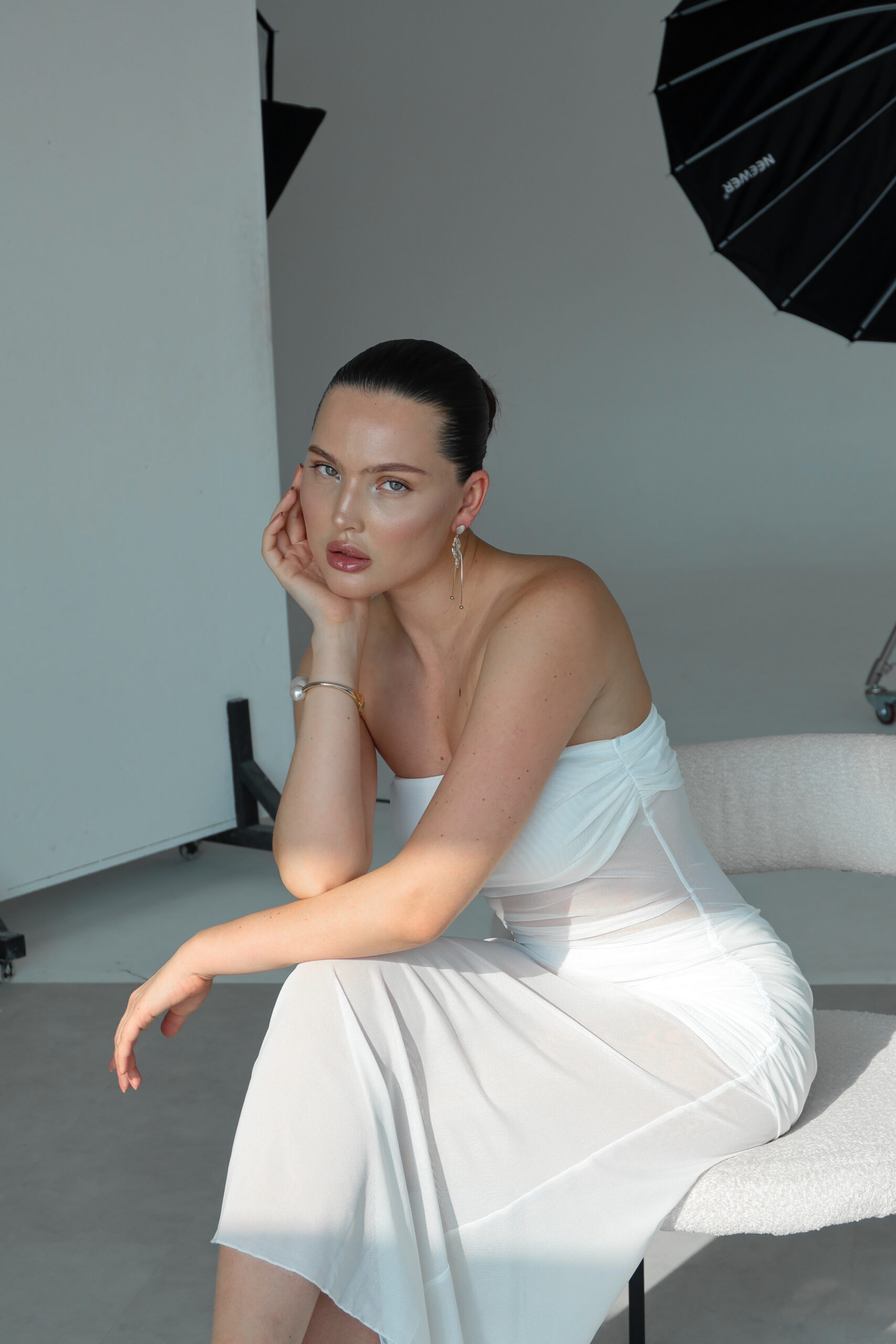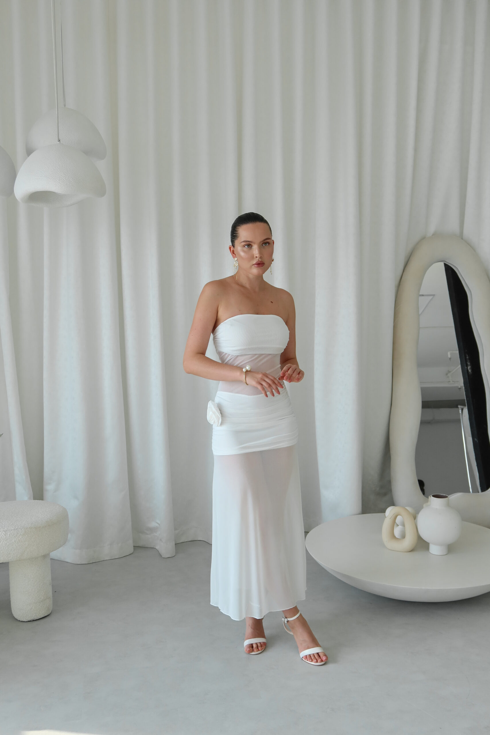 Ethereal and striking, the Ivory Whisper Sheer Panel Gown is a stunning strapless silhouette that marries softness with bold structure. Featuring a rushed bandeau-style bodice, a sheer mesh waist cutout and a flowing semi-transparent skirt, this dress captivates with its dreamy movement and modern romanticism. A single rosette embellishment on the hip adds a a soft feminine accent.