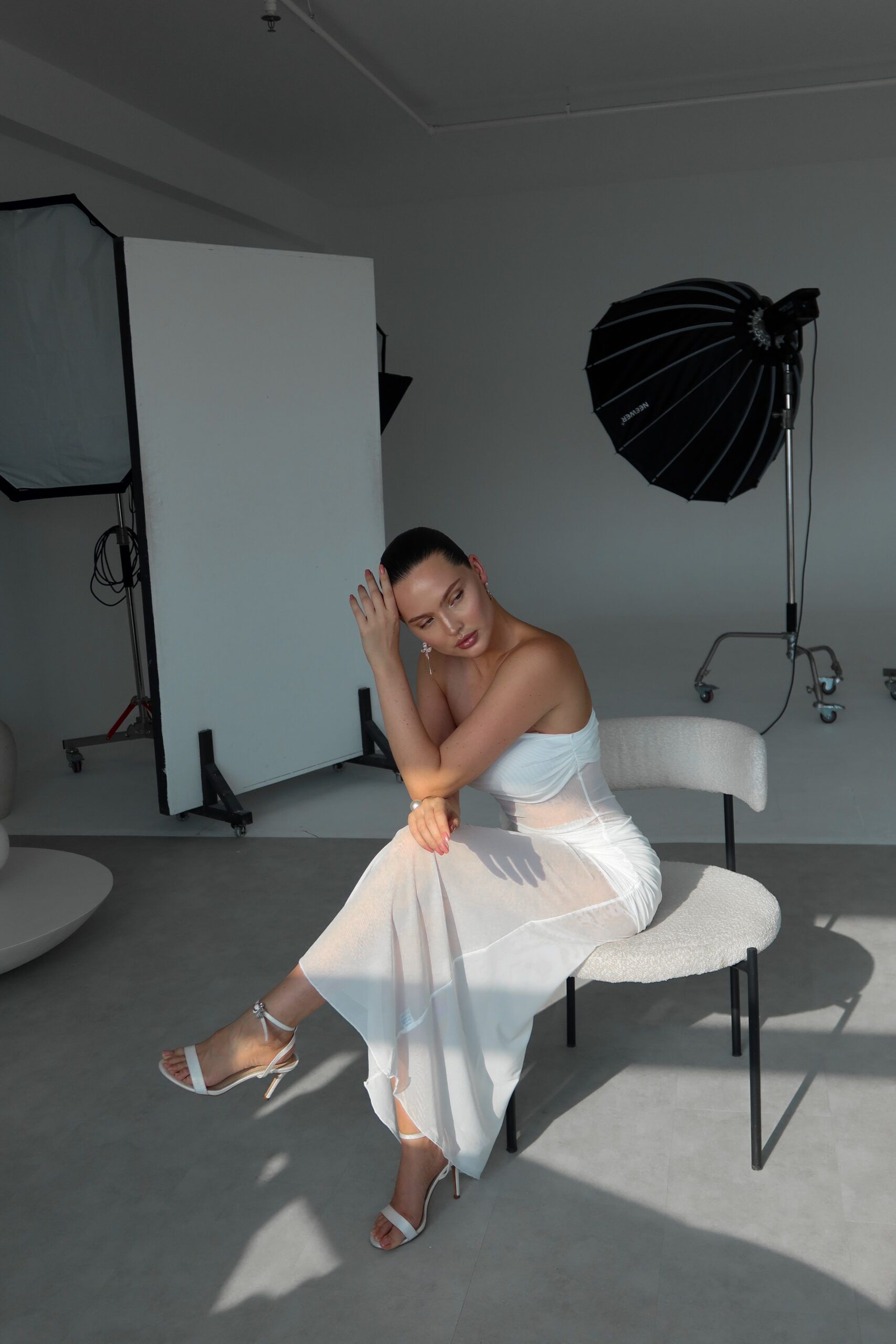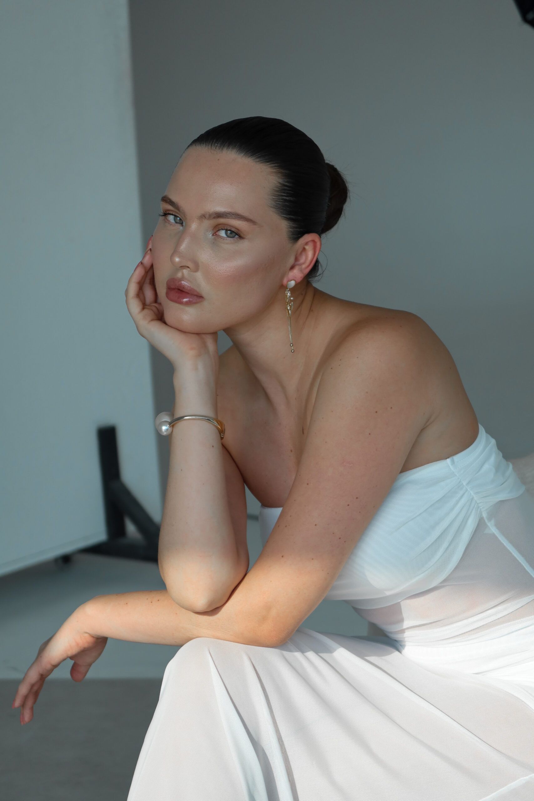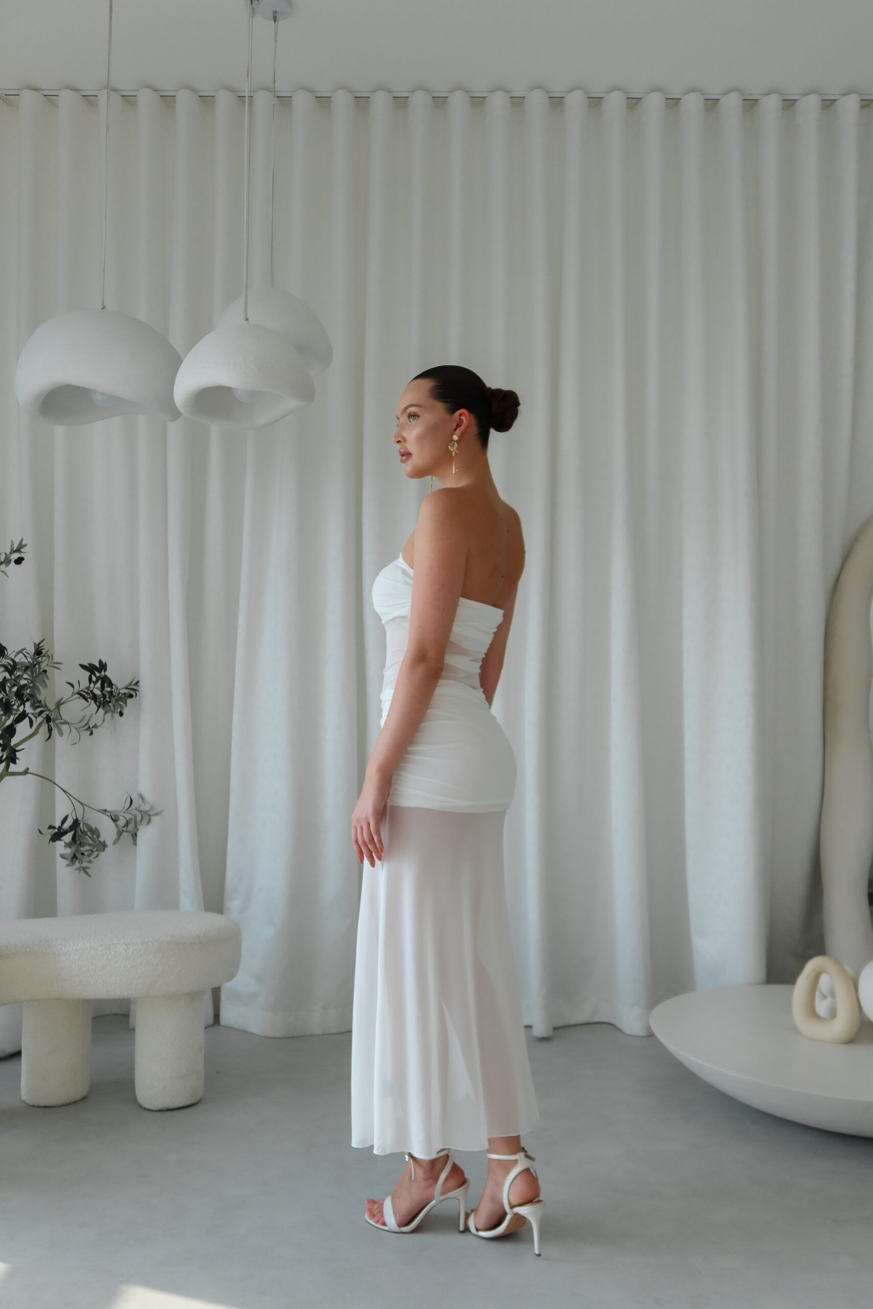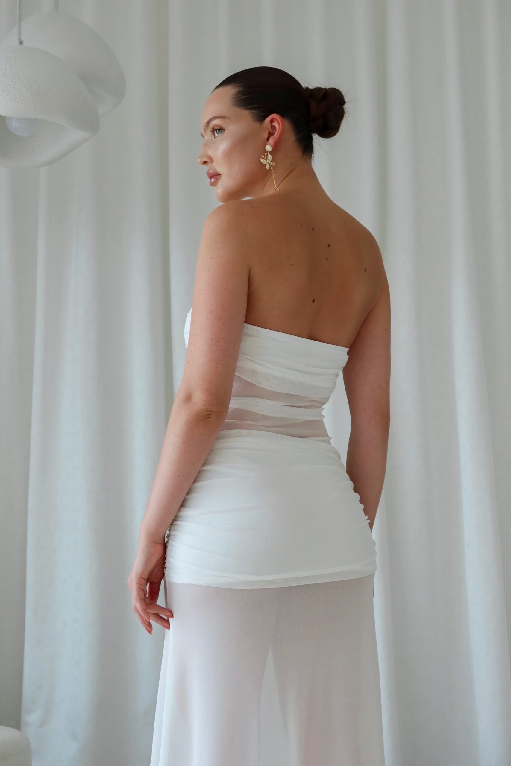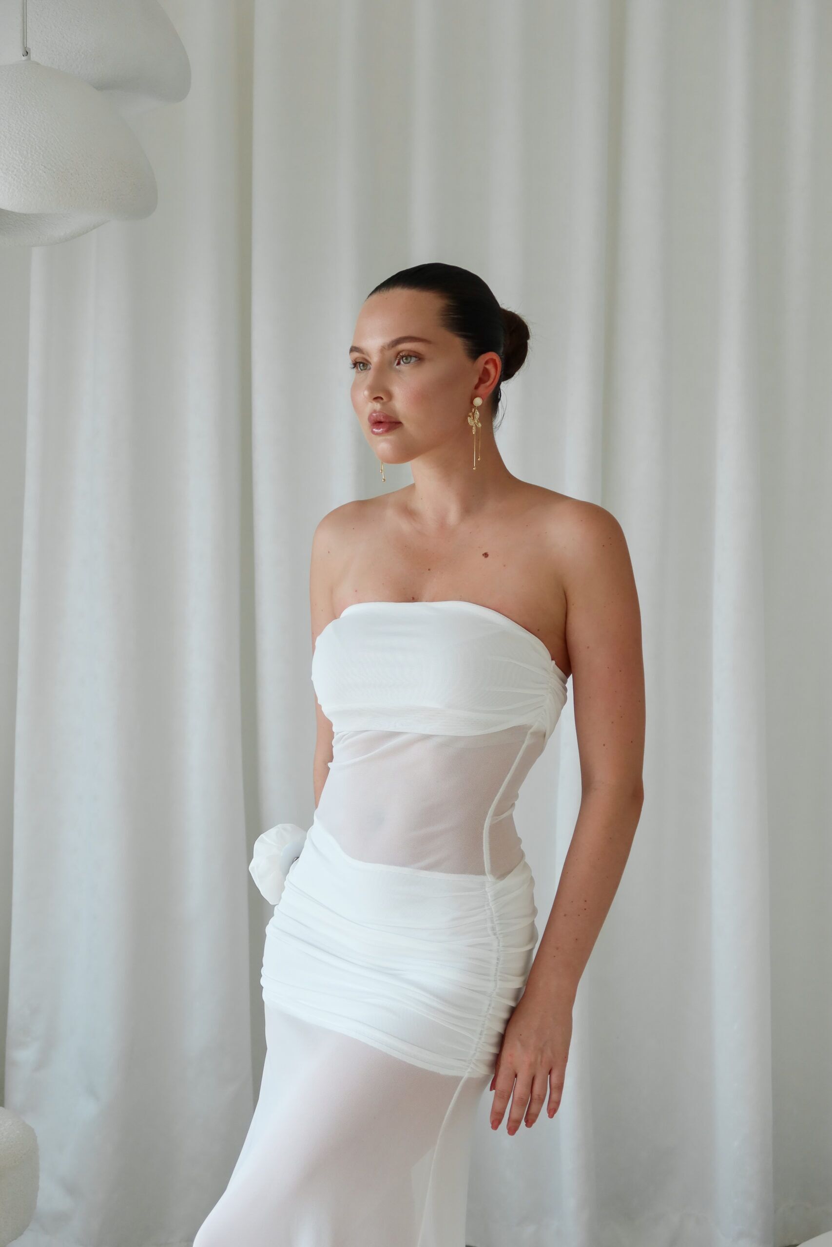 Ethereal and striking, the Ivory Whisper Sheer Panel Gown is a stunning strapless silhouette that marries softness with bold structure. Featuring a rushed bandeau-style bodice, a sheer mesh waist cutout and a flowing semi-transparent skirt, this dress captivates with its dreamy movement and modern romanticism. A single rosette embellishment on the hip adds a a soft feminine accent.